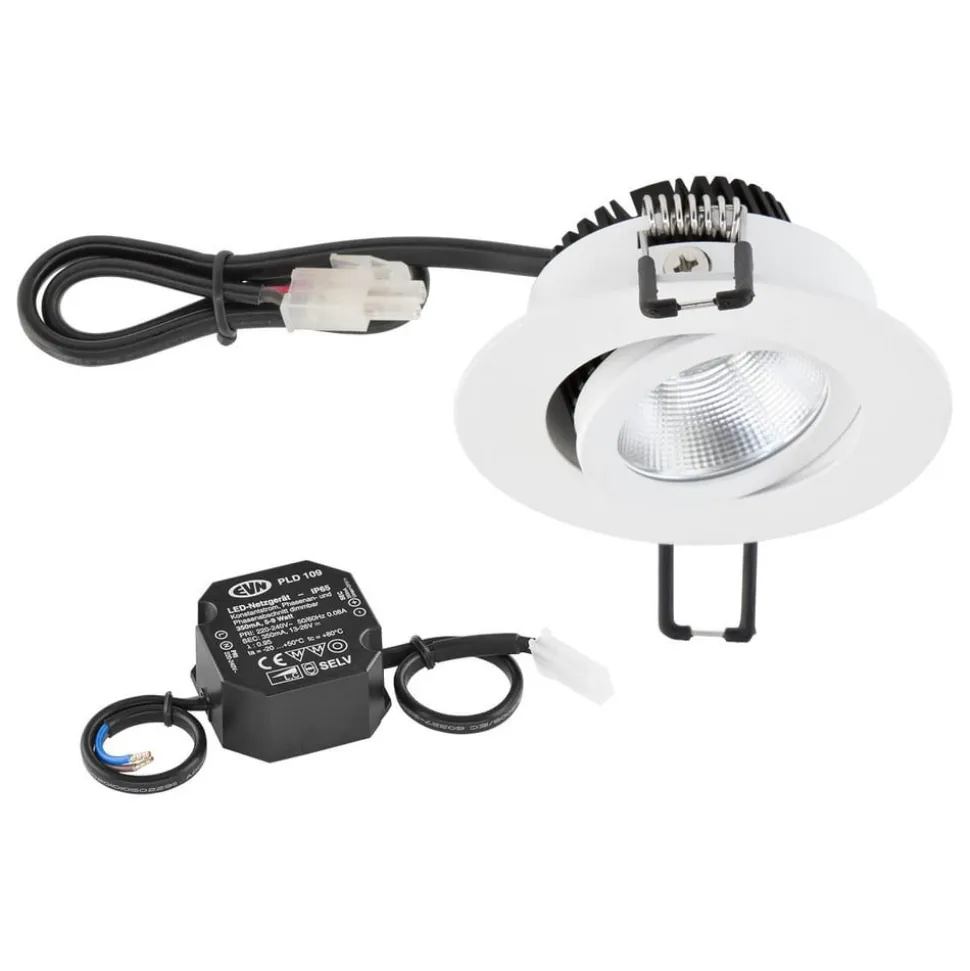 Drejelig LED-indbygningslampe PC20 med COB-LED og strømforsyning Den drejelige LED-indbygningslampe PC20 har et 30 cm langt tilslutningskabel med AMP-stik. Huset af pulverlakeret aluminium i høj kvalitet suppleres harmonisk af en skærm af klart glas. Anvendelsesmulighederne er mange: Med sin kraftige COB-LED er den velegnet til alle former for indendørs brug. Uanset om det er som rumbelysning, målrettet spotlight eller effektlys – enkeltvis eller i kombination bringer PC20-indbygningsarmaturet pålideligt lys ind i mørket – egnet til møbelkonstruktion (brandbeskyttelsesmærke MM) – COB LED – inkl. LED-strømforsyningsenhed (længde på tilslutningskabel 15 cm) – dæmpbar via forkant- og bagkantfasedæmper