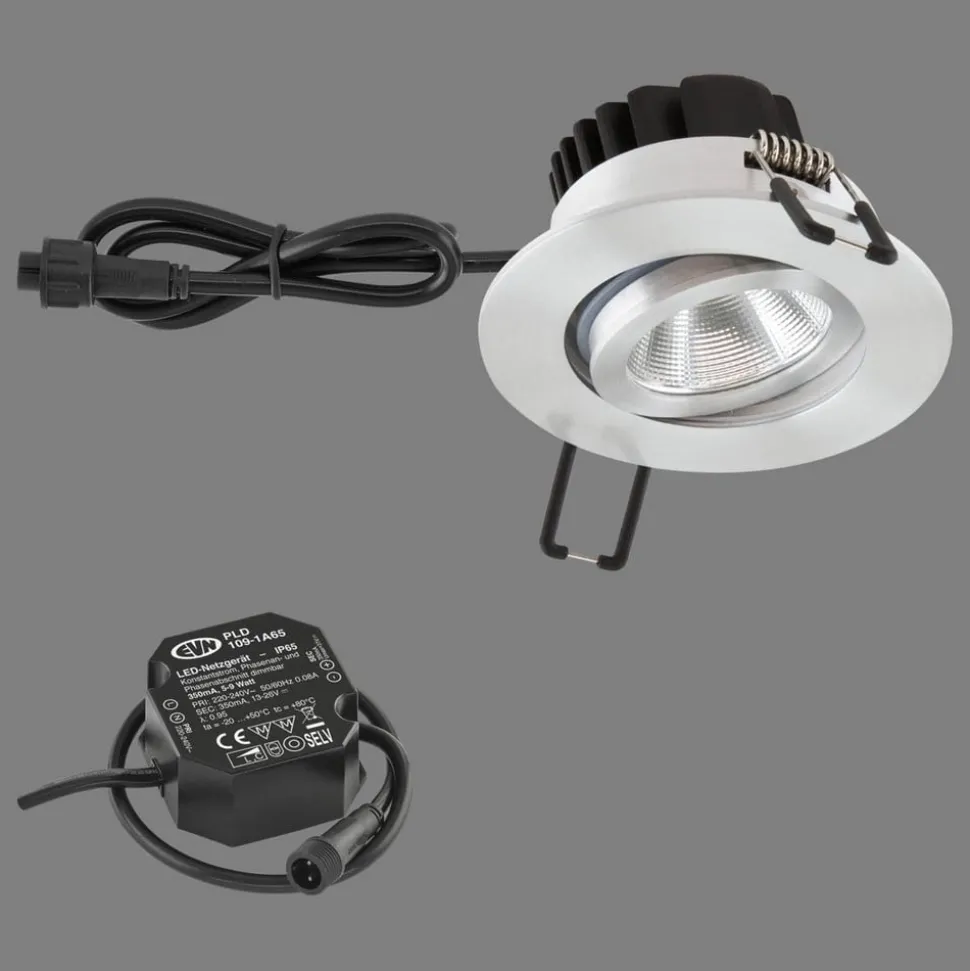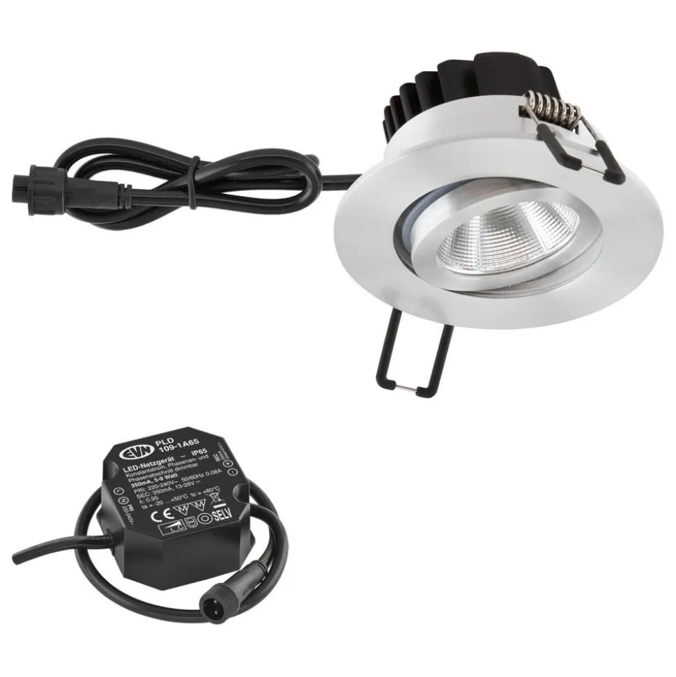 PC65 drejelig LED-indbygningslampe til udendørs brug med strømforsyning PC65 LED-indbygningslampen er fremstillet af pulverlakeret aluminium og har et hus af høj kvalitet. En rude af gennemsigtigt glas fungerer som afdækning. Det sobre design af denne indbyggede udendørslampe sikrer, at den passer diskret ind i loftet og kan bruges i fugtige rum og udendørs områder uden problemer takket være IP65-beskyttelsesgraden (beskyttelse mod vandstråler og støvtæt). LED-indbygningslampen PC65 udsender med sin kraftige LED-chip et varmt hvidt lys og oplyser indgangspartiet, passager i gården og terrasser eller kan bruges som spotlight til målrettet effektbelysning – egnet til møbelkonstruktion (brandbeskyttelsesmærke MM) – længde på forsyningskabel 30 cm (IP65-stik) – COB LED – inkl. LED-strømforsyningsenhed (længde på tilslutningskabel 15 cm) – dæmpbar via forkant- og bagkantfasedæmper