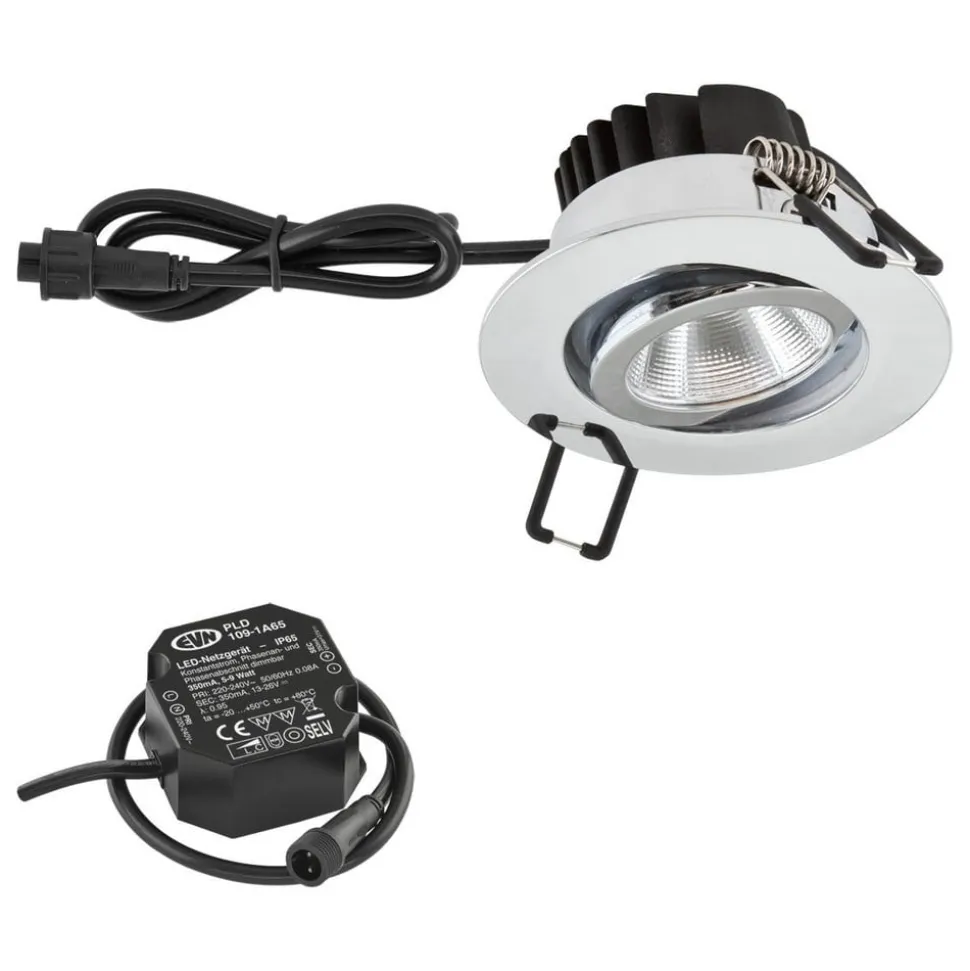 PC65 drejelig LED-indbygningslampe til udendørs brug med strømforsyning PC65 LED-indbygningslampen er fremstillet af pulverlakeret aluminium og har et hus af høj kvalitet. En rude af gennemsigtigt glas fungerer som afdækning. Det sobre design af denne indbyggede udendørslampe sikrer, at den passer diskret ind i loftet og kan bruges i fugtige rum og udendørs områder uden problemer takket være IP65-beskyttelsesgraden (beskyttelse mod vandstråler og støvtæt). LED-indbygningslampen PC65 udsender med sin kraftige LED-chip et varmt hvidt lys og oplyser indgangspartiet, passager i gården og terrasser eller kan bruges som spotlight til målrettet effektbelysning – egnet til møbelkonstruktion (brandbeskyttelsesmærke MM) – længde på forsyningskabel 30 cm (IP65-stik) – COB LED – inkl. LED-strømforsyningsenhed (længde på tilslutningskabel 15 cm) – dæmpbar via forkant- og bagkantfasedæmper