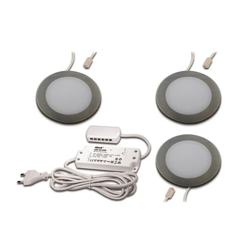 Rund, dæmpbar FAR 58 LED-møbelindbygningslampe i et tilslutningsklart sæt på 3 FAR 58 er en møbelindbygningslampe med en rund ramme i rustfrit stål-look og plastafskærmning, som passer perfekt ind i moderne miljøer og også kan bruges i badeværelser og vaskerum. De tre lamper i sættet er udstyret med tilslutningskabler, og den transformer, der er nødvendig for driften, er inkluderet til tilslutning til stikkontakten. Hvis det er nødvendigt, er dæmpning mulig med en ekstern controller (medfølger ikke) – Leveres i et sæt af 3 med LED-transformer (230 V til 24 V) med netstik – Meget god farvegengivelse: CRI > 90 – Udstyret med 250 cm langt tilslutningskabel (Hera LED 24 stik) – Minimumsafstand til naboarmatur: 5 cm
