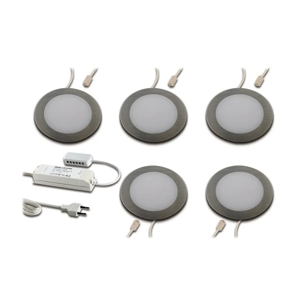 Sæt med 5 – rund LED-møbelindbygningslampe FAR 58 Dette tilslutningsklare sæt med 5 inklusive LED-transformer til tilslutning til stikkontakten er ideelt til montering i skabe og paneler – i både tørre og fugtige områder. Med sin runde ramme i rustfrit stål og plastafskærmning er FAR-møbelindbygningslampen visuelt afdæmpet og moderne. Dens LED’er giver et bredt lysområde, hvis intensitet kan reguleres ved hjælp af en ekstern controller (medfølger ikke) – Leveres i et sæt på 5 med LED-transformer (230 V til 24 V) med netstik – Meget god farvegengivelse: CRI > 90 – Udstyret med 250 cm tilslutningskabel (Hera LED 24 stik) – Minimumsafstand til naboarmatur: 5 cm