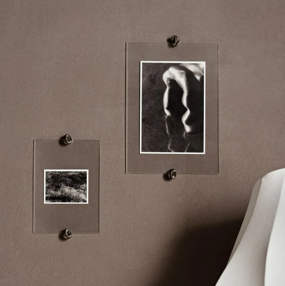 Gravel-billedramme af akryl og messing Med Gravel-billedrammen kan du tilføje et strejf af raffinement og personlig stil til din bolig. Denne elegante, moderne ramme består af to akrylpaneler, der er sat sømløst sammen af skulpturelle beslag lavet af støbt messing, der minder om små sten. For at vise det billede, du ønsker, skal du blot sætte de to messingbeslag fast på væggen. Derefter placerer du billedet mellem de to akrylpaneler og sikrer det ved at fastgøre de støbte messinghætter til beslagene. Dit billede er nu sikkert og elegant indrammet. Plejeanvisning: Tørres af med en tør klud.
