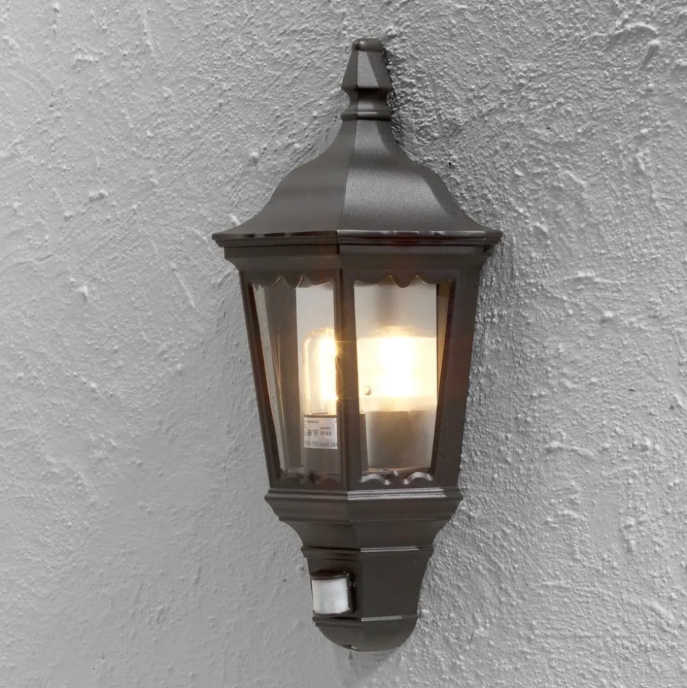 Nostalgisk Firenze-væglampe af aluminium med praktisk bevægelsesdetektor Denne antikt udseende udendørs væglampe af aluminium monteres direkte på væggen, hvor den ikke går glip af sin dekorative effekt og giver stemningsfuld belysning. Den integrerede bevægelsesdetektor har en rækkevidde på 5 meter og en detekteringsvinkel på 120°. Belysningens varighed kan indstilles fra 5 sekunder til 8 minutter.