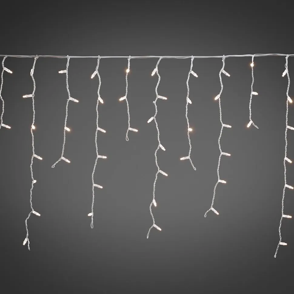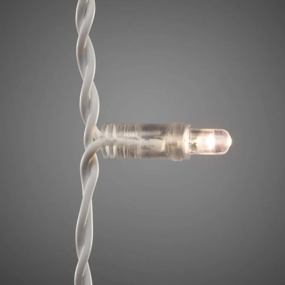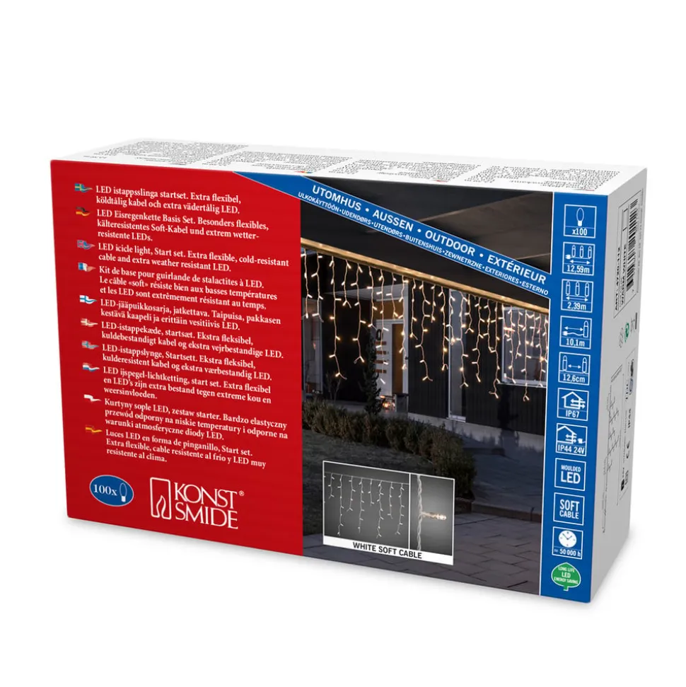 System 24 – Startsæt 100-pære lysforhæng Dette startsæt indeholder et 100-pære lysforhæng med hvidt blødt kabel, der kan modstå temperaturer under nul. Systemet kan udvides til en længde på op til 60 meter eller 450 LED-pærer. Leveringsomfanget inkluderer en udendørs transformer – Øget kapslingsgrad (IP67) takket være formstøbte LED’er