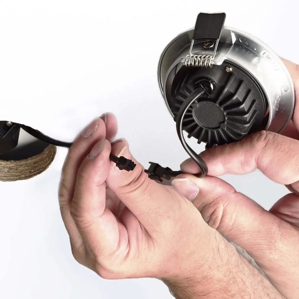 Drejelig indbygget loftlampe med LED Dione med IP44-beskyttelse Den indbyggede loftlampe med LED Dione imponerer med sin særligt lave installationsdybde. Det gør den meget pladsbesparende og kræver kun et hulrum i loftet på 25 mm. Tilslutningsboksen og den dæmpbare strømforsyning, der er inkluderet i leveringsomfanget, passer også ind i den 68 mm store udskæring takket være det kompakte design. Da alle komponenter er formonteret til brug, er der mulighed for tidsbesparende installation uden brug af værktøj. Tilslutningsboksen med plug-in-terminaler muliggør også 3-polet gennemfortrådning. Dette gør indbygningslampen til den ideelle løsning til eftermontering i et renoveringsprojekt eller til nye installationer med begrænset installationsplads. COB-teknologien af høj kvalitet gør det muligt for indbygningslampen at levere et højt, effektivt output. Huset er lavet af aluminium, strålevinklen er 36°, og lampehovedet kan vippes op til 30° – Armatur og strømforsyning med adapterstik – Stænktæt, IP44 – Mulighed for gennemfortrådning – Inkluderer dæmpbar strømforsyning og tilslutningsboks Tilslutningsboksen leveres med 2 skruer i forskellige længder, kort skrue ved brug af tynde kabler, lang skrue ved brug af NYM 3×1,5 installationskabler osv.