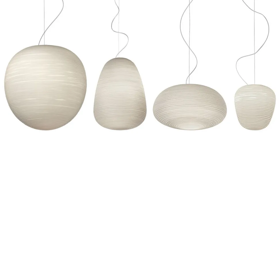 Foscarini Rituals – pendellampe af mundblæst glas Ikke kun det filigranskårne glas på Rituals-pendellampen, men også dens pæreform minder om traditionelle japanske papirlanterner, som stadig bruges i dag ved japanske festivaler eller processioner eller som dekorative genstande foran restauranter eller templer. Designerparret Ludovica + Roberto Palomba overtog denne orientalske karakter og fortolkede den på en moderne måde, da de designede Rituals-armaturserien ved hjælp af mundblæst glas af høj kvalitet. Den pæreformede glaskrop på Rituals-pendellampen fra Foscarini har et fint, vandret snitmønster, der giver det egentlig kølige, hårde materiale et blødt og blidt udseende. Lyset, der skinner gennem glaskroppen, er også varmt og harmonisk, hvilket gør Rituals til den perfekte lyskilde til hyggelige timer. Der anvendes en særlig blæseteknik i produktionen af glasskærmen, hvor glasset ikke drejes i formen. Stribemønsteret er skabt af negative dekorationer i formen, som er præget på glassets overflade. De sidste detaljer lægges på i hånden, inden glasset til sidst dyppes i syre for at opnå den gipseffekt, der gør Rituals-lampeserien unik.