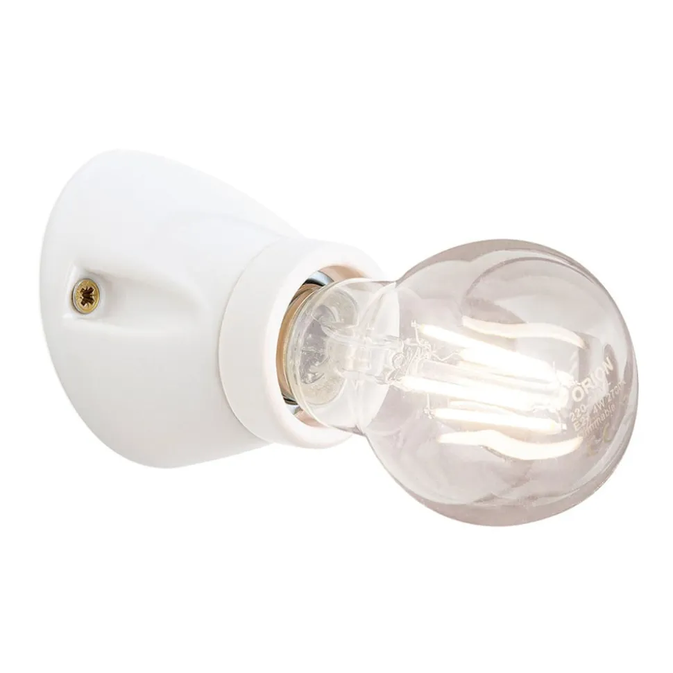 Frost keramisk fatningslampe – til væg- eller loftsmontering (vinkel: 45°) Frost-væglampen er et lille, men desto mere effektivt belysningstilbehør til interiør i retrostil. Den består ganske enkelt af et vægbeslag af glaseret keramik, hvori der er indbygget en E27-fatning. Der kan bruges lyskilder (herunder LED) med en maksimal effekt på 60 watt. Det ser bedst ud, når der bruges retrofit-lamper i et rustikt design, som vist på billedet. Lyskilden er ikke inkluderet i leveringen. Egnede lamper fås som tilbehør – eksternt dæmpbar
