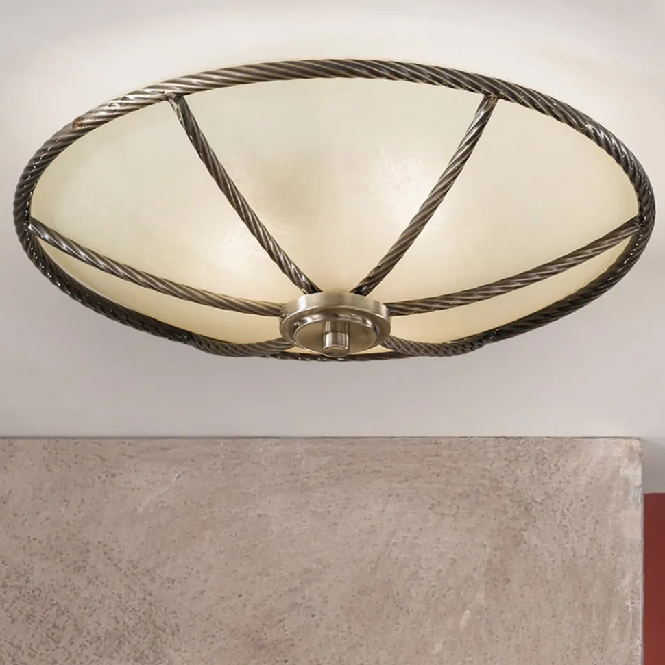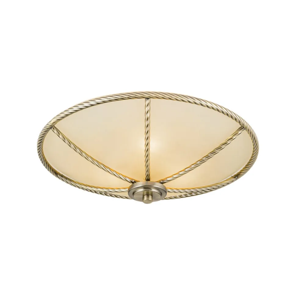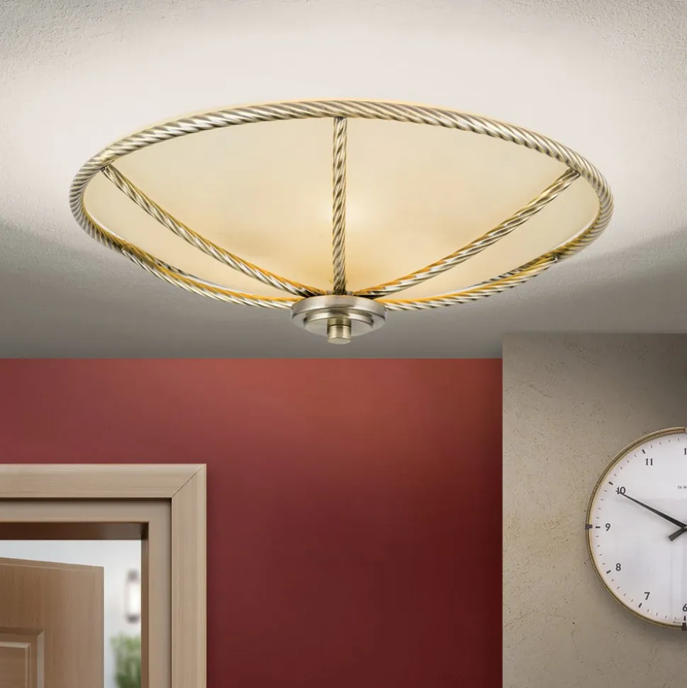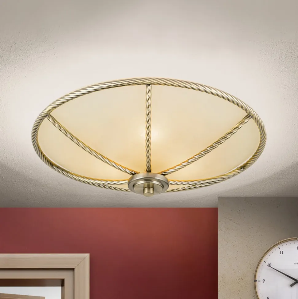 Smuk belysning i klassisk stil: Galina-loftslampen overbeviser med cremefarvet glas og metalelementer i gammel messingDen, der leder efter den rigtige belysning til en klassisk indrettet stue, vil helt sikkert kunne lide Galina-loftslampen. Lyset her skinner i en særlig varm tone, fordi den matte glasskærm ikke bare er hvid, men i en tiltalende cremefarvet nuance. En anden bemærkelsesværdig detalje er metalrammen og metalkanterne, fordi overfladestrukturen her ikke er glat, som man kunne forvente, men imiterer strukturen i et snoet reb.