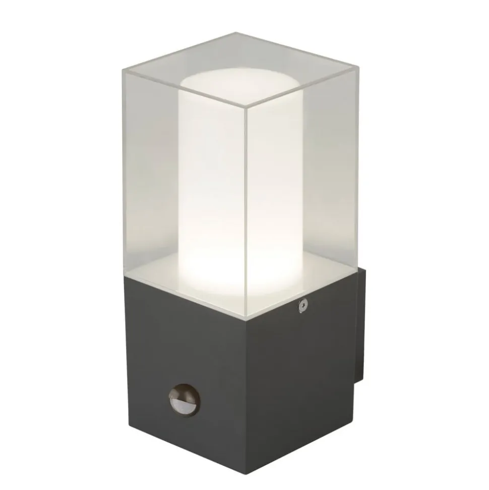 Mørkegrå Granada udendørs væglampe med bevægelsessensor Granada-væglampen til udendørs brug ser ud, som om den er lavet af et enkelt stykke. Granada er udstyret med en bevægelsessensor og tænder kun lyset, når der registreres bevægelse. Det betyder, at armaturet kun er tændt, når der er brug for lys, og at der kan spares energi sammenlignet med konstant belysning. Granada har et moderne look, hvilket gør den til en lyskilde, der kan kombineres på mange forskellige måder. Sensorens tekniske data: – Registreringsvinkel: 90° – Registreringsområde: 2-8 m – Maks. monteringshøjde: 1,8 m – Tidsindstilling: min. +10/-5 sek.; maks. +4/-1 min
