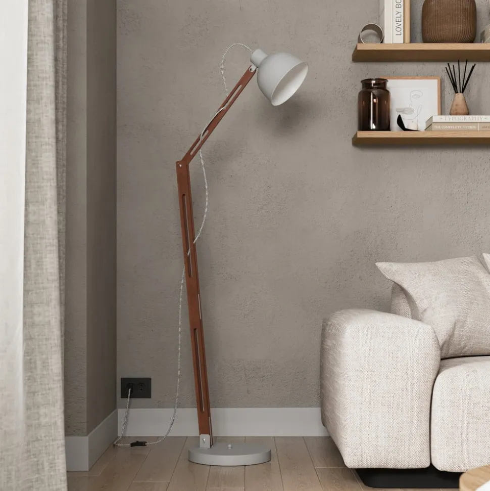 Gulvlampen Skansen kombinerer industrielt design med funktionel fleksibilitet. Lampen er fremstillet af en harmonisk kombination af træ og metal og passer perfekt ind i moderne stuer og spisestuer. Den grå farve i kombination med mørkt træ giver lampen en tidløs elegance, der fungerer både som dekorativt element og praktisk lyskilde.