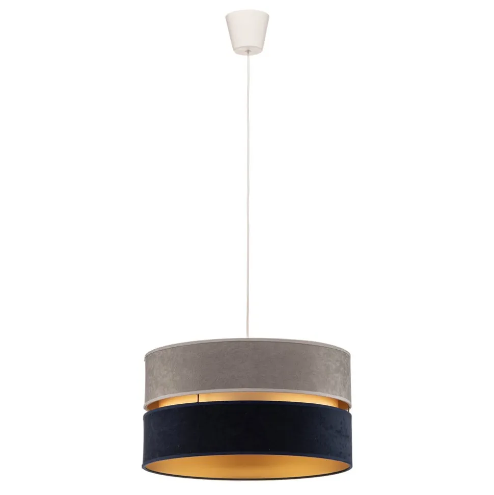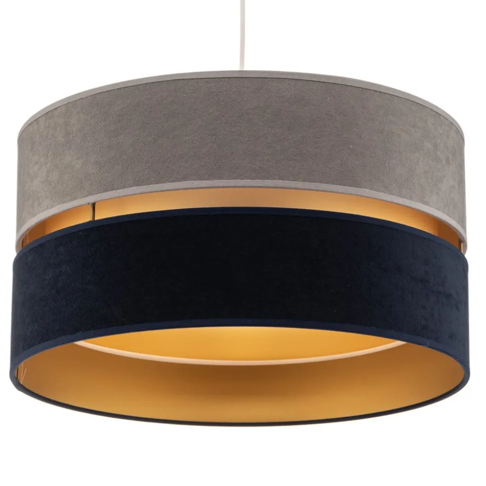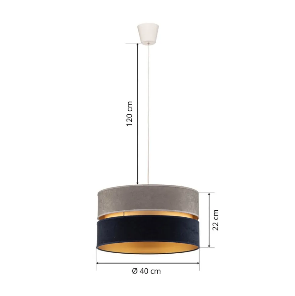 Hængelampen Duo imponerer med sit moderne design og den luksuriøse kombination af marineblåt, gråt og gyldent fløjl. Denne stilfulde belysningsløsning passer perfekt ind i forskellige rum som stuen, køkkenet, soveværelset og spisestuen. Den eksklusive materialeblanding giver ethvert rum et særligt præg og skaber en harmonisk atmosfære.