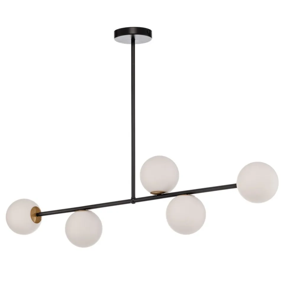 Hængelampen Gama 5 med 5 lyskilder har et moderne design, der imponerer med sin kombination af pulverlakeret stål og glas. Farven i sort, hvid og guld giver lampen en tidløs elegance, der passer perfekt ind i forskellige rumkoncepter. Uanset om det er i stuen, køkkenet eller spisestuen, sætter denne lampe stilfulde accenter og skaber en behagelig lysstemning.