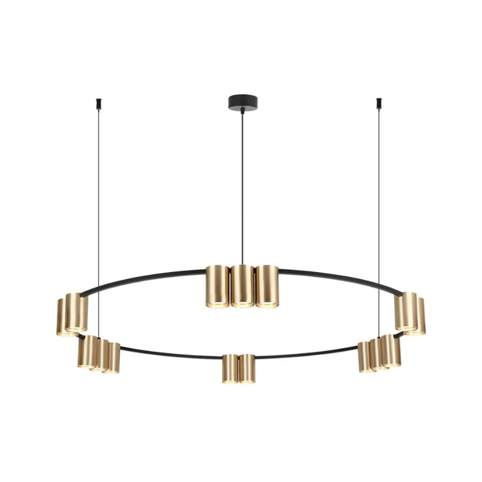 Hængelampen Genesis kombinerer moderne design med aluminiumets tidløse elegance i en stilfuld sort og guldfarve. Denne lampe er et imponerende eksempel på fusionen mellem form og funktion, ideel til rum som stuer, spisestuer, køkkener eller arbejdsværelser. Med en diameter på 100 cm og udstyret med 15 GU10-fatninger tilbyder den en imponerende lysstyrke, der kaster et nyt lys over ethvert rum.