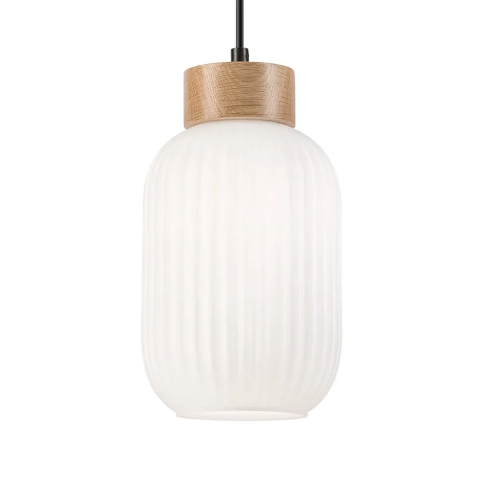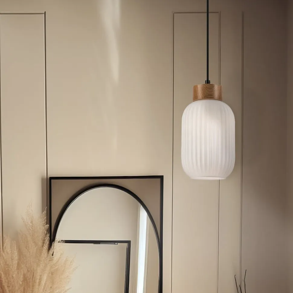 Hængelampe Harmony med hvid glasskærm og trædetaljer