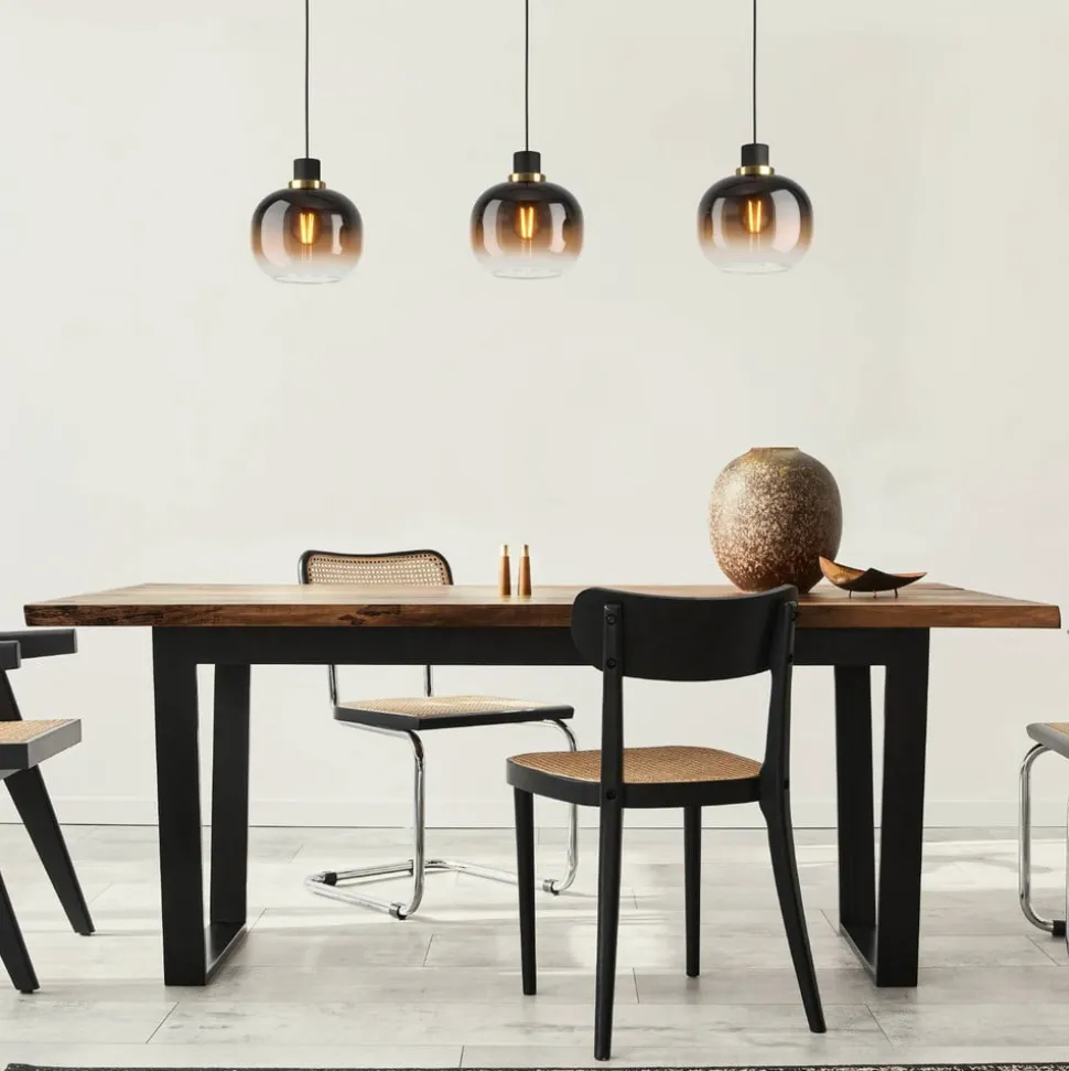 3 lyskilder Oilella pendellampe med dekorativt farvede glasskærme Oilella pendellampen består af tre kugleformede lampeskærme i glas med en spændende farvegradient. Lampeskærmene er hver især kombineret med et sort metalbeslag og suppleret med et dekorativt element i børstet messing. Hængelampen i trendy farvetoner giver behagelig belysning til ethvert rum – uanset om det er i stuen eller spisestuen, for eksempel over et aflangt spisebord – eksternt dæmpbar