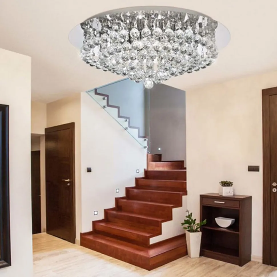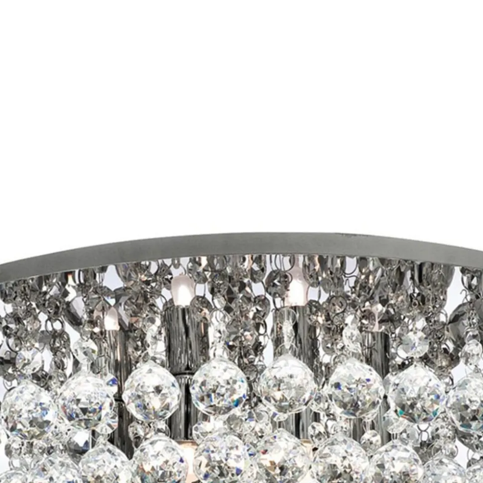 Hanna loftslampe med glaskrystalpendel Den yndefulde Hanna loftslampe imponerer ikke kun med sin særlige lyseffekt, men også med sit visuelle udseende. Et stort antal glaskrystaller er fastgjort til en skinnende loftsplade i krom, og de er individuelt udformet som små kugler. Når lyset er tændt, skaber den prismelignende struktur en behagelig og elegant gnist, samtidig med at den giver en god lyseffekt i hele boligen. Uanset om det er i stuen eller i indgangspartiet, er Hanna-loftslampen et øjeblikkeligt og glamourøst blikfang.