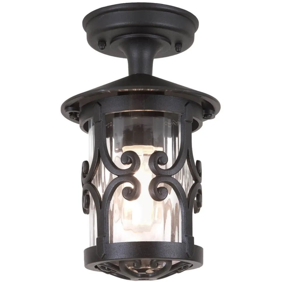 Hereford- loftlampe med sin lygte designet i engelsk look er ideel til den hyggelige belysning af overdækkede udendørsarealer – verandaer, terrasser, baldakiner osv. Det er meget holdbart lavet af trykstøbt aluminium og passer med sin sort finish og klare glasskærm godt sammen med de mest forskellige udendørsarealer. De attraktive metaldekorationer på skærmen er meget dekorative og yder også beskyttelse af glasset bagved.