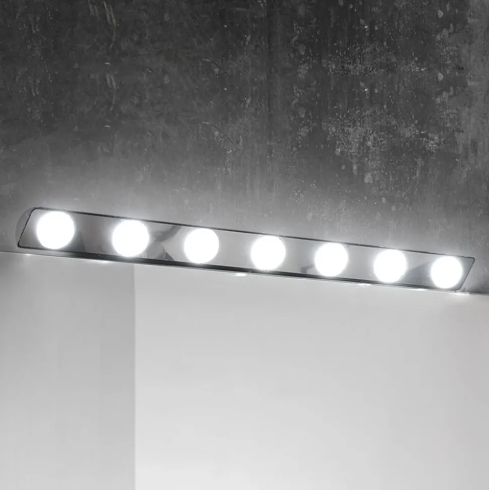 LED-spejlarmatur Hollywood består af en strimmel med en elegant skinnende kromfinish. Den er udstyret med syv runde diffusorer, der indeholder dagslys hvide LED’er. Takket være den fleksible montering kan Hollywood anvendes horisontalt eller vertikalt, som spejl, påbygget møbelarmatur eller vægarmatur, alt efter behov. Armaturet leveres med vægtilslutningsboks med 35 cm langt tilslutningskabel.