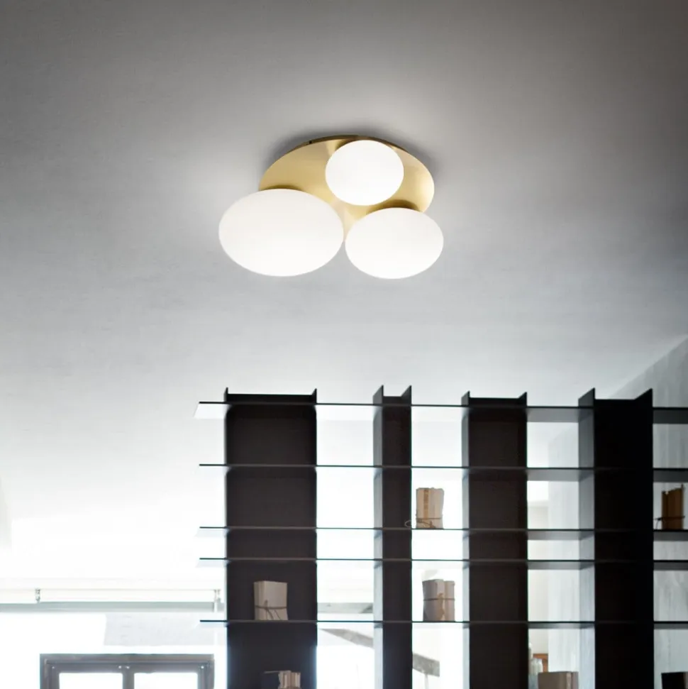 Ninfea rund loftlampe i messing med tre opale glas Ninfea-loftlampen er en elegant og behagelig lyskilde til stuer og opholdsrum. Den har en flad, rund baldakin i metal med messingfinish. Nedenunder er der tre linseformede lampeskærme i forskellige størrelser af opalglas, som spreder det varmhvide lys homogent. Der medfølger matchende LED-pærer.