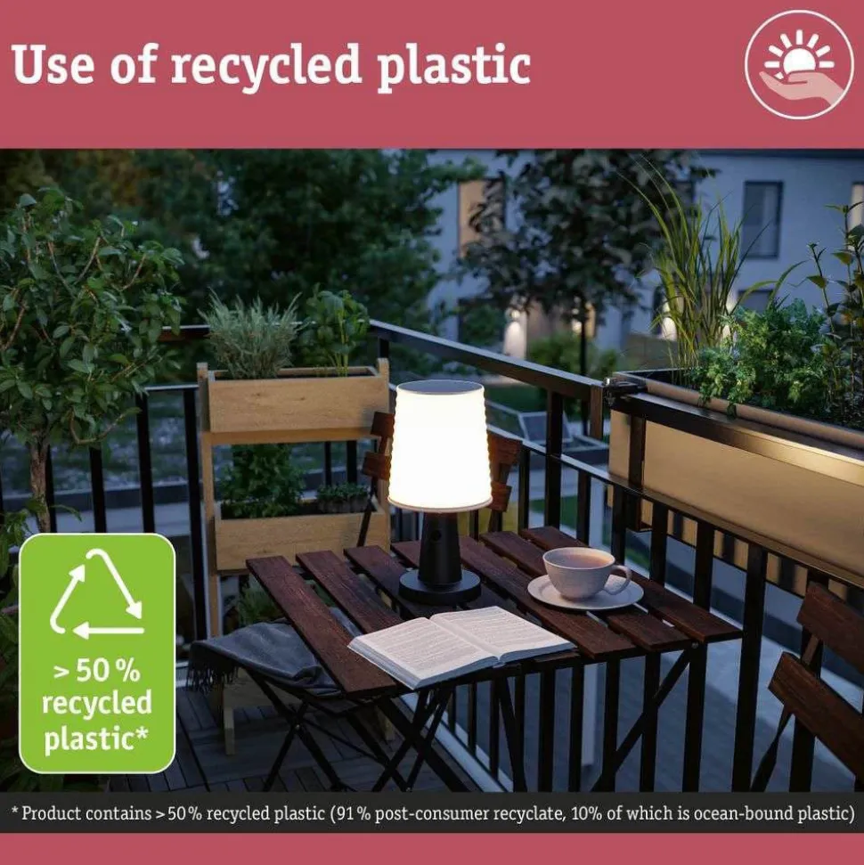 Ilanga Solcelle Lampe Anthracite – Paulmann er den perfekte kombination af bæredygtighed og fleksibilitet. Som en del af Paulmanns sortiment af bordlamper og portable solcellelamper, tilbyder denne lampe en miljøvenlig løsning til dit hjem. Fremstillet af over 50% genbrugsplast, er Ilanga både stilfuld og ansvarlig. Det integrerede solpanel sikrer et effektivt energiforbrug, mens den praktiske USB-C forbindelse giver dig mulighed for at oplade lampen hvor som helst. Med en højde på 30 cm og en diameter på 15 cm, passer den antracitfarvede lampe perfekt både indendørs og udendørs. Skab en hyggelig læsekrog i stuen eller en stemningsfuld atmosfære på terrassen med dens behagelige varmhvide lys. Lampen kan dæmpes i tre trin, så du kan tilpasse belysningen efter dine behov. Med en IP44 beskyttelsesgrad er den vejrbestandig og ideel til udendørs brug.