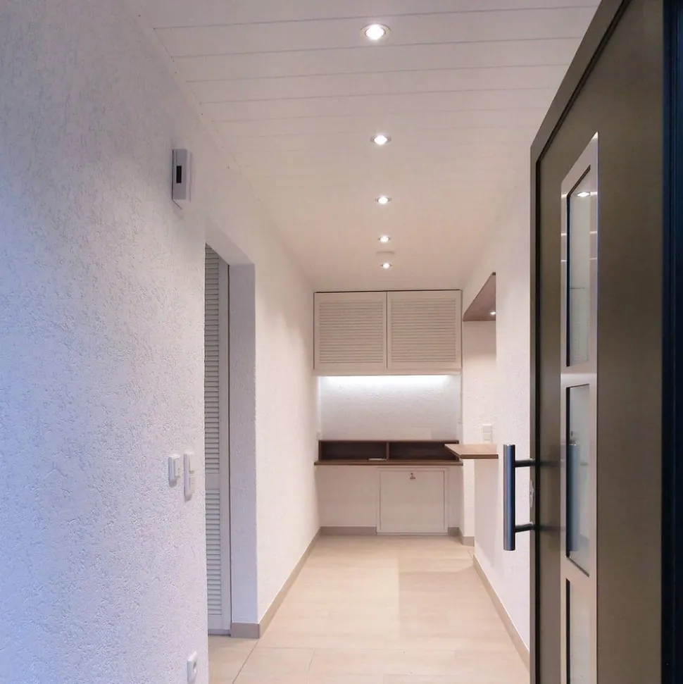 Den runde indbygget spotlight med LED Dione kræver kun et lofthulrum på 25 millimeter til montering, da den har en særlig lav indbyggedybde. Tilslutningsboksen og det dæmpbare LED-netværk er en del af leveringsomfanget og kan også placeres i loftudskæringen på grund af den kompakte konstruktion. Diones komponenter er formonterede, hvilket muliggør en hurtig installation uden brug af værktøj.