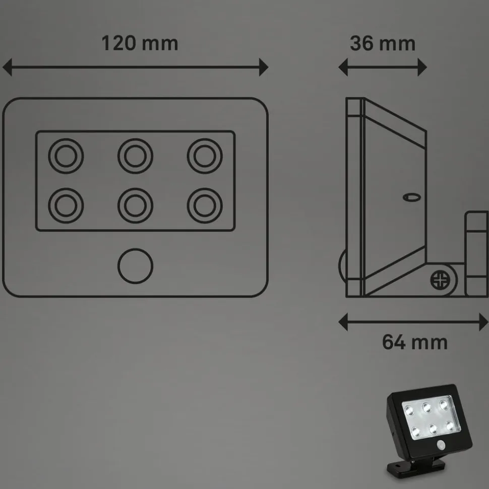 Udendørs LED-vægprojektør Kollig med bevægelses- og skumringssensor, batteridrevet, IP54Dette lille udendørsarmatur med bevægelsessensor, der kan drejes 60 grader nedad i henhold til beskyttelsesklasse IP54, er beskyttet mod regn og ideel til indkørsler, garager, husindgange, terrasser og haver. Bevægelsessensoren har en rækkevidde på 3 meter og en detekteringsvinkel på 80-100 grader. Når væglampen registrerer bevægelse, tændes den i 45 sekunder. den udendørs LED-væglampe får strøm fra 6 AAA-batterier. De er inkluderet i leveringsomfanget, og det samme er fastgørelsesmaterialet. Når der registreres bevægelse i mørket, tændes den takket være en lyssensor. Man kan også indstille et konstant lys hele dagen. Lyset er 6.500 kelvin koldt hvidt.