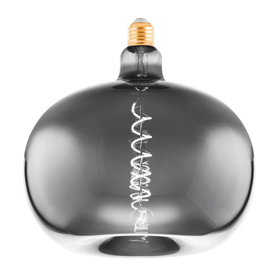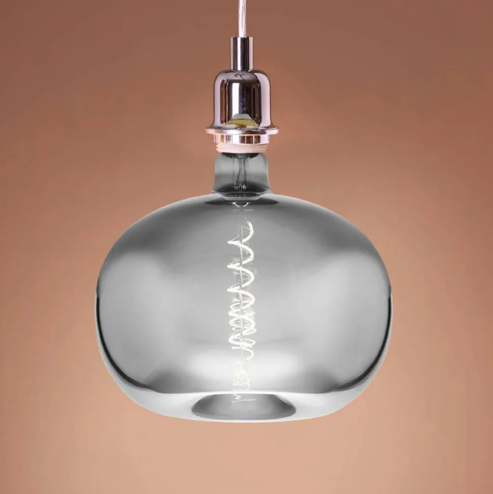 LED-pære E27 4W Big Size i form af et æble Denne store LED-pære med E27-sokkel er et blikfang i alle åbne armaturer. Den har form som et æble, glasset er forkromet, men stadig gennemsigtigt, så LED-trådene, der er smukt arrangeret i en spiralform, er synlige, når de er tændt, og kommer bedst til deres ret – dæmpbar med mange almindelige dæmpere som Busch, Gira, Jung, Siemens og mange flere.