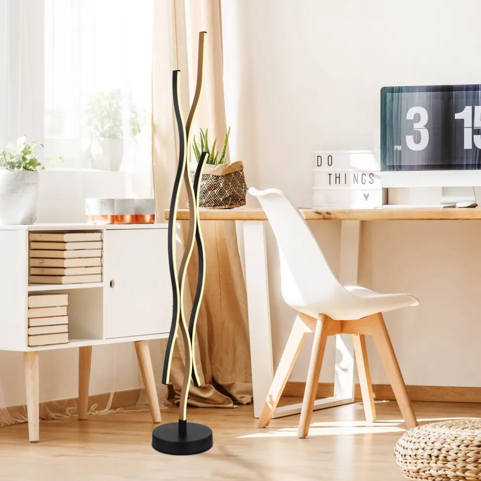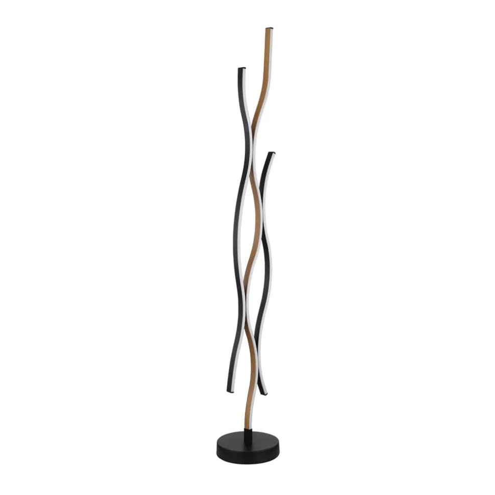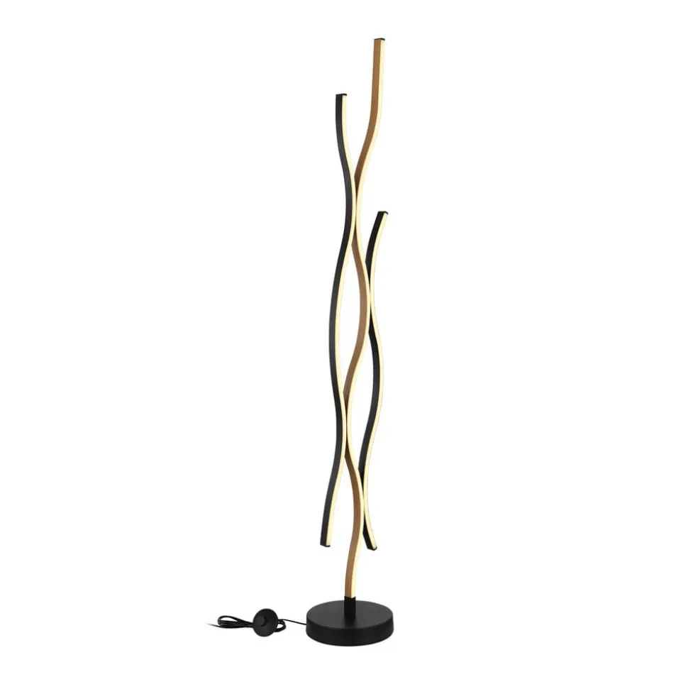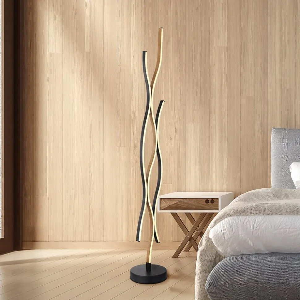 LED-gulvlampen Geronimo forener moderne design med funktionel belysning. Lampen er fremstillet af aluminium, metal og plast og passer perfekt ind i moderne stuer og spisestuer. Den elegante kombination af sort og træfarvet finish giver ethvert rum et stilfuldt præg. Den integrerede LED-lyskilde giver et energibesparende og varmhvidt lys, der skaber en behagelig atmosfære.