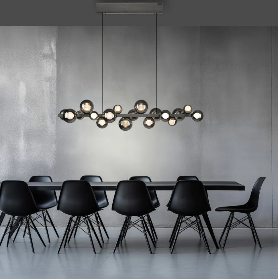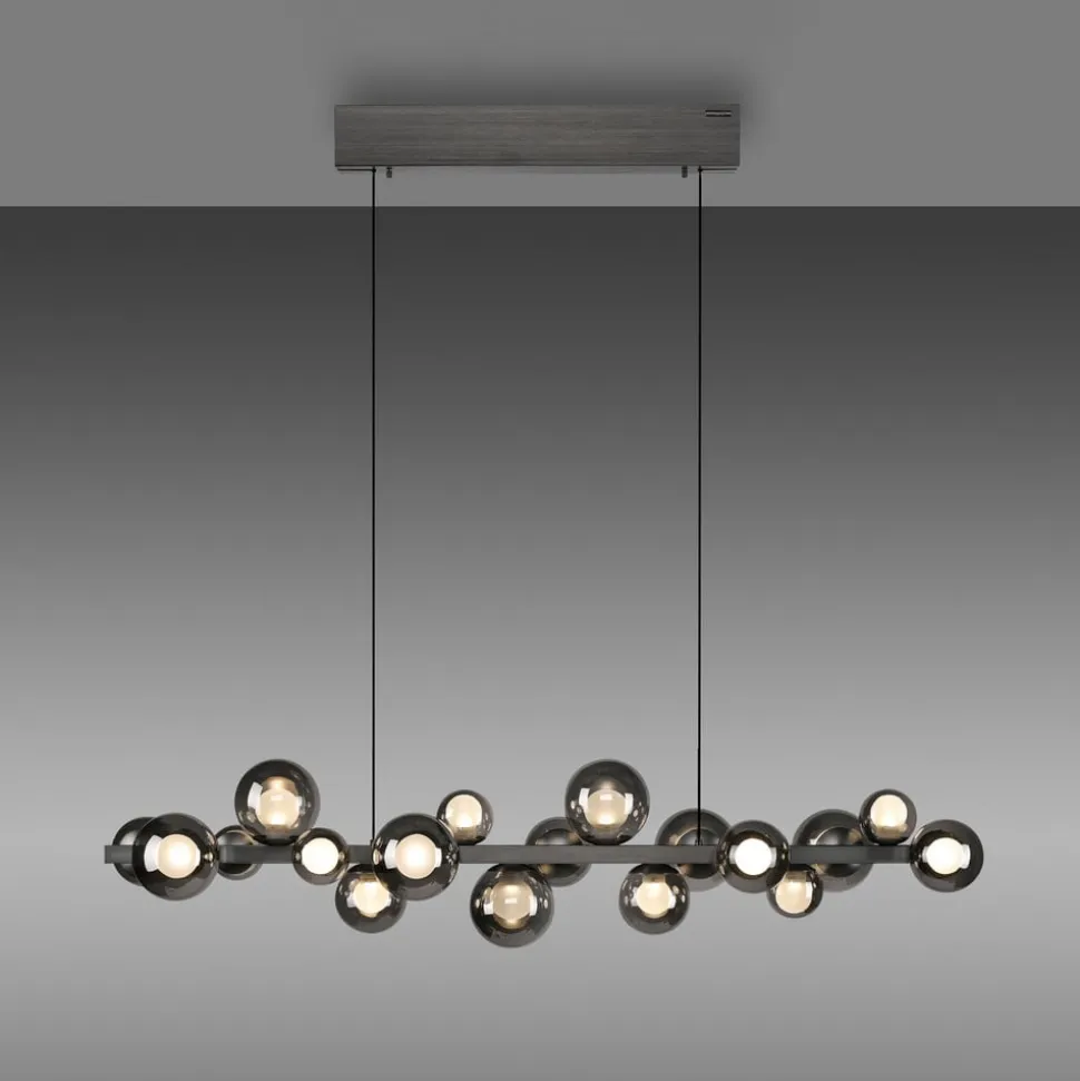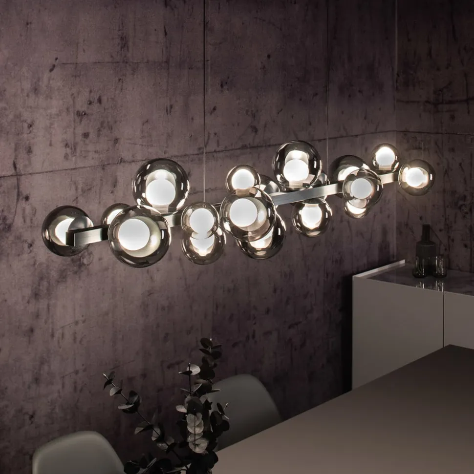 Fleksibel, dekorativ og alsidig i moderne boligindretning – sådan præsenterer LED-pendellampen PURE E-Popup sig. Den er udstyret med 18 kugleformede lampeskærme af glas, der hver især består af en ydre, gennemsigtig sfære og en indre, satineret sfære. LED’erne, der er integreret i kuglerne, er dæmpbare og kan reguleres i farvetemperatur (2.200 til 5.000 K) med den medfølgende fjernbetjening. Desuden muliggør e-LIFT-funktionen en elektrisk drevet højdejustering; elektronikken er placeret i baldakin. Når lampen tændes igen, er den sidst valgte indstilling tilgængelig igen (hukommelsesfunktion).
