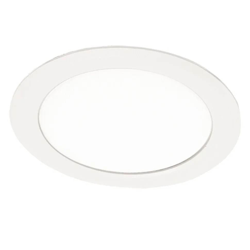 Stænktæt LED-indbygningslampe loda i et rundt og hvidt design Den indbyggede downlight loda er det ideelle valg som visuelt diskret loftsbelysning i alt fra receptionsområder til badeværelser. Den synlige del af det runde armatur udgøres af en hvid plastring og en opal skærm. Bag denne er der et hus med en køleplade i aluminium. loda monteres i 1 til 2 cm tykke lofter med fastgørelsesfjedre – Montering med medfølgende fastgørelsesfjedre – Lysudsendelse: 100 % direkte – Levetid: 50.000 h L80/B10 – Inkluderer ikke-dæmpbar elektronisk driver – Tilslutning: kabellængde 100 cm, Ø ledninger 2 x 0,75 mm²