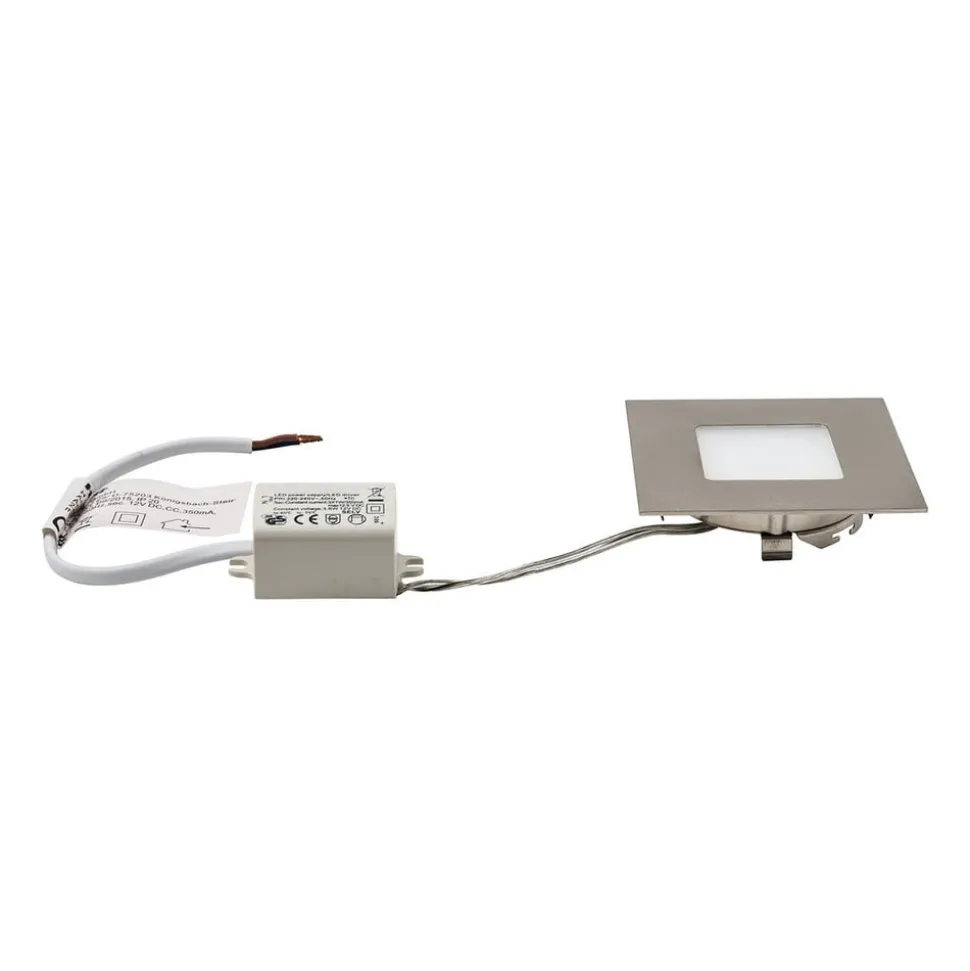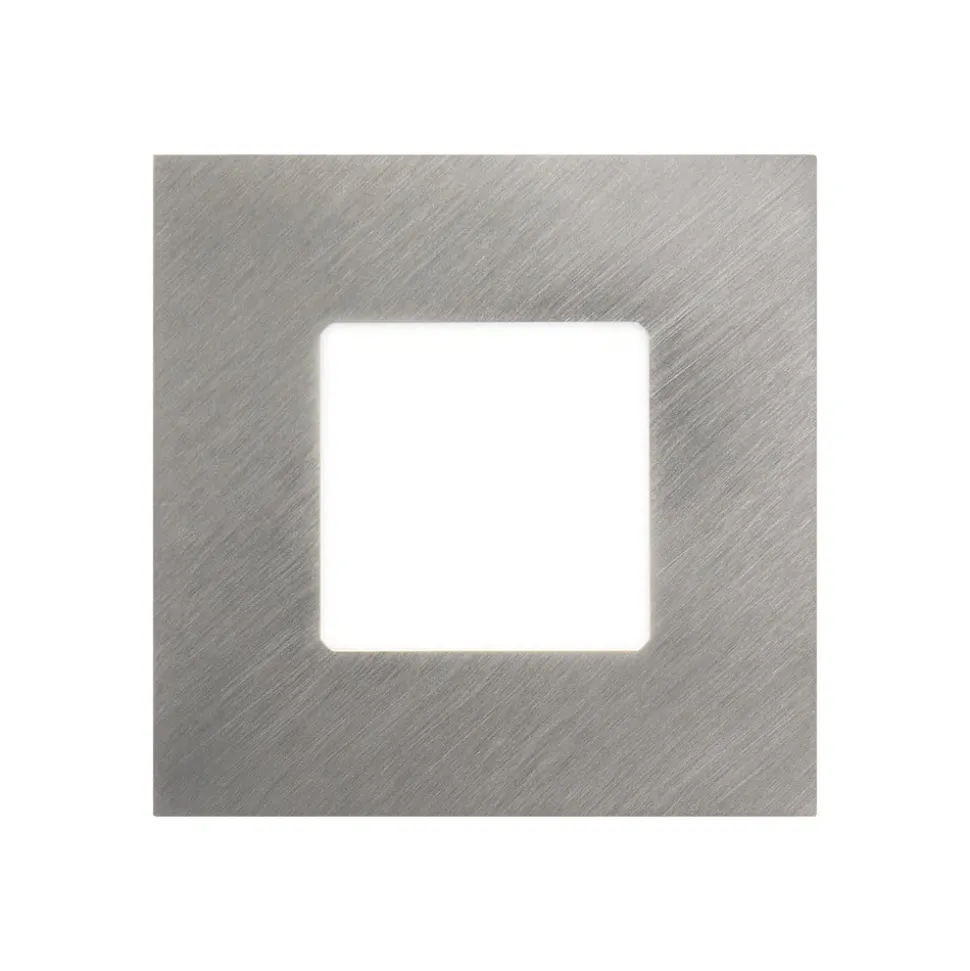 Attraktivt Klaus LED-panel til praktisk installation i afbryderbokse Klaus LED-panelet udsender et varmhvidt lys (33 lumen) med sine permanent installerede 12 LED’er og sætter elegante accenter. Flere Klaus LED-paneler kan kombineres for at skabe et fremragende orienteringslys, f.eks. til belysning af trapper. Huset er lavet af en aluminiumslegering, og ballasten er inkluderet i leveringsomfanget. Den er nem at installere takket være den praktiske boksinstallation – LED-driver (medfølger) – Indbygningsboks (medfølger ikke)