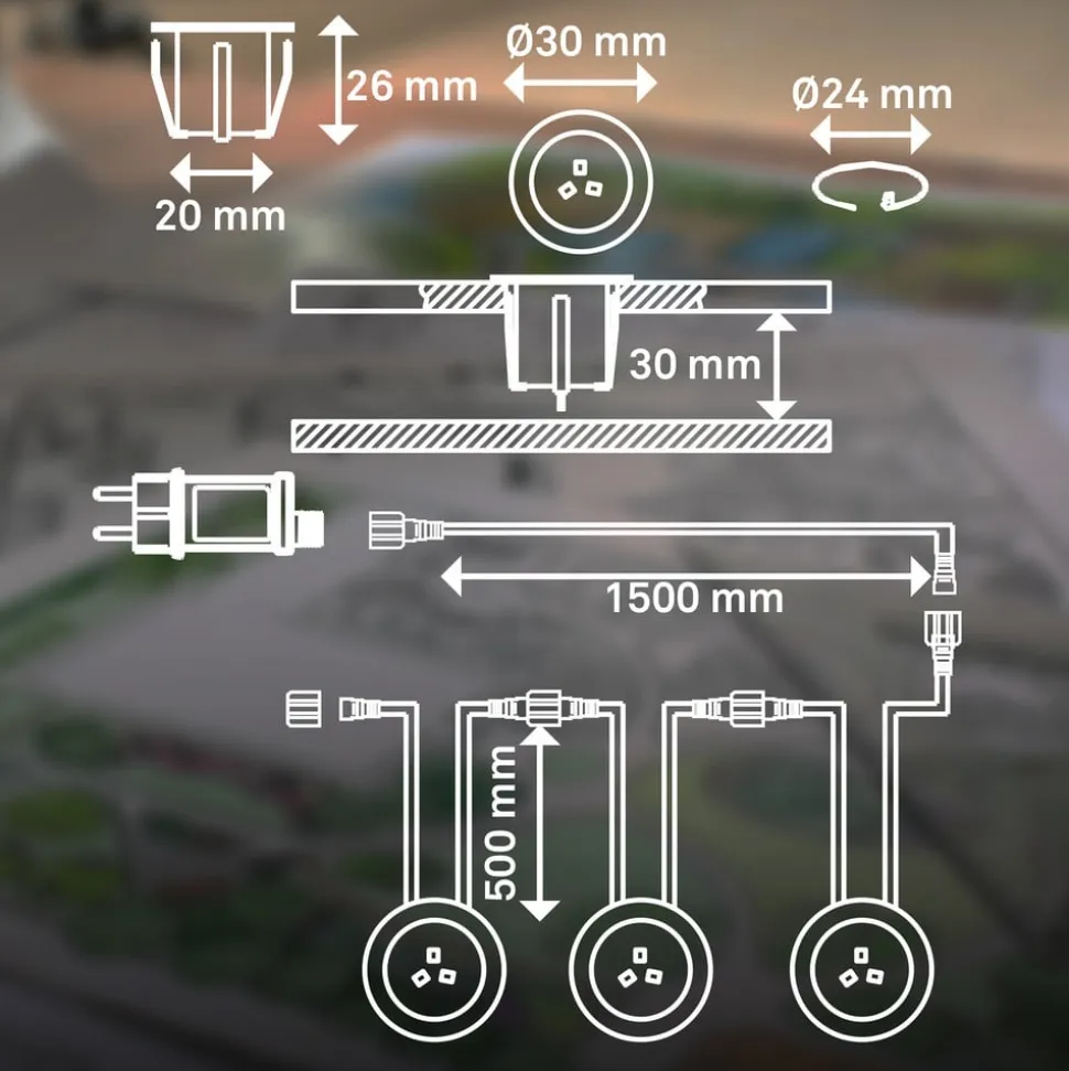 Dette sæt med tre varmhvide LED-indbygningsspots er et komplet sæt til Briloners 12 V udendørslampe-system. De runde spots har rustfrit stålhus og plastdæksel og leveres med passende tilslutningskabler med stik til 12 V-systemet. En udendørs stiknetadapter til 230 V-tilslutning til stikkontakten medfølger. Afhængigt af behovet kan yderligere komponenter (se tilbehør) eller lamper fra 12 V-systemet tilføjes.