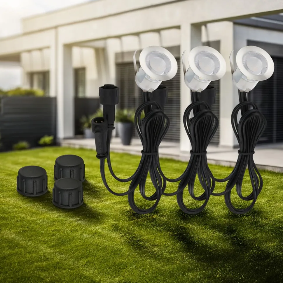 Udvidelsessæt til 12 V udendørsbelysning – tre runde LED-indbygningsspots Ø 3 cm i stål