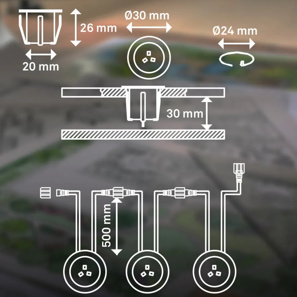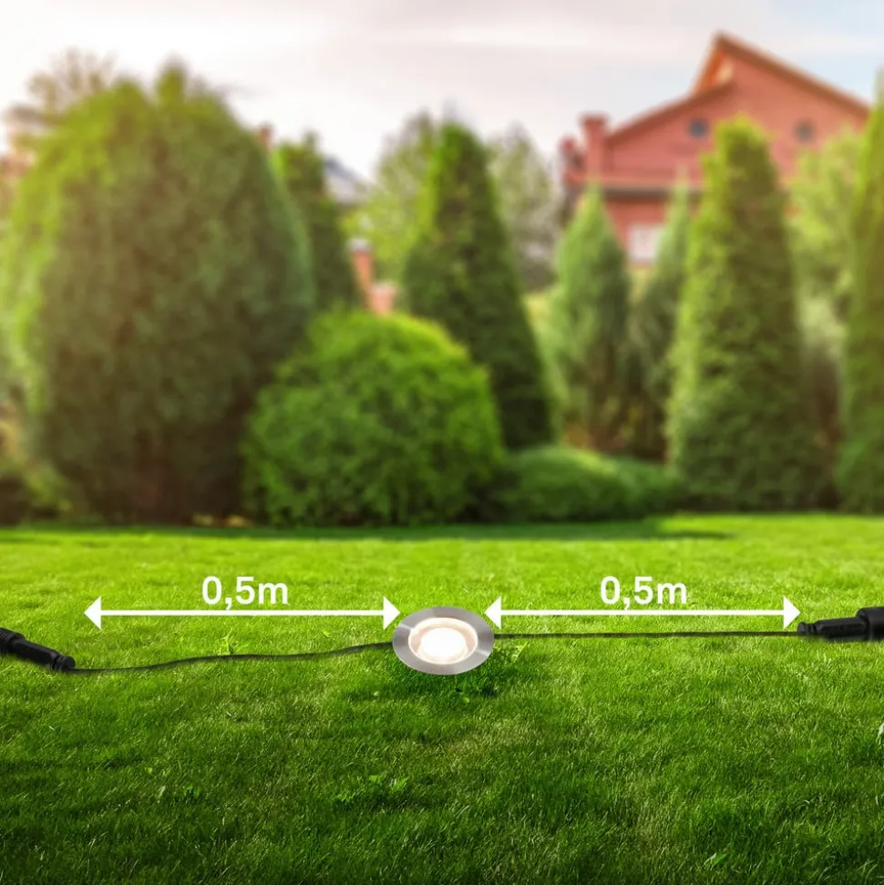 Dette sæt med tre varmhvide LED-indbygningsspots er til udvidelse af Briloners 12 V udendørslampe-system. De runde spots har rustfrit stålhus og plastdæksel og leveres med passende tilslutningskabler med stik til 12 V-systemet. En udendørs stiktransformator til 230 V-tilslutning til stikkontakten er ikke inkluderet – der kræves et startsæt (se tilbehør).