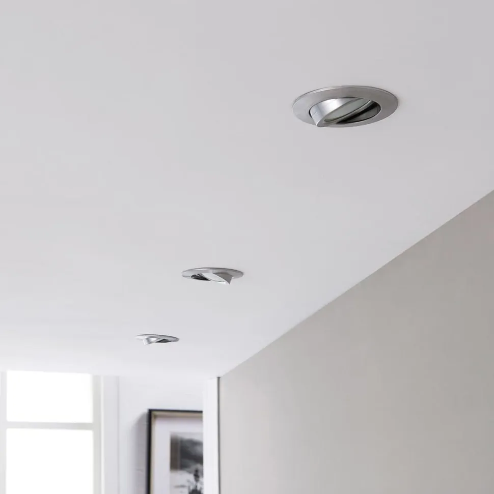 Praktisk sæt med tre runde LED-indbygningslamper med meget lav indbygningsdybde LED-indbygningslamperne Andrej har en aluminiumsfarvet finish, der giver dem et tidløst look. Disse indbygningslamper kan derfor bruges på en relativt alsidig måde. Lyskildeindsatserne, som kan drejes op til 25° på begge sider, bidrager til den særlige funktionalitet, da det gør det muligt at bestemme lysudsendelsen individuelt. LED-teknologien muliggør en særlig energibesparende rumbelysning, og når man bruger tre indbygningslamper fra serien, får man naturligvis mere lys og kan oplyse et rum kraftigere og mere jævnt.