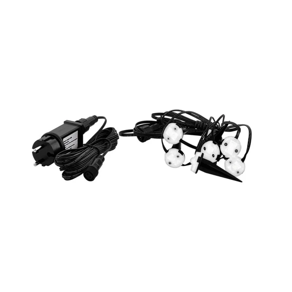 - inklusive jordspyd, udendørs plug-in strømforsyningsenhed til 230V-tilslutning, lavspændingstilslutningskabel med tilslutningsstik