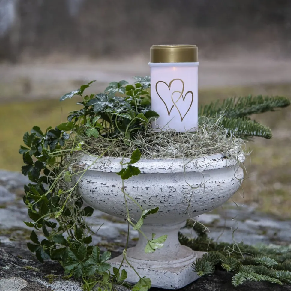 Hearty LED-gravlys med skumringskontakt og jordspyd Hearty er især beregnet til gravudsmykning. Det cylinderformede LED-gravlys er udformet som et klassisk gravlys med en krop af plast og et guldfarvet låg. Motivet af gyldne hjerter pryder ydersiden. Det stænktætte (IP44) LED-gravlys kan bruges permanent udendørs og er nemt at sætte fast takket være jordspyddet. Den drives af solceller og et genopladeligt batteri (medfølger). Den integrerede dagslyssensor muliggør automatisk skift baseret på den omgivende lysstyrke.