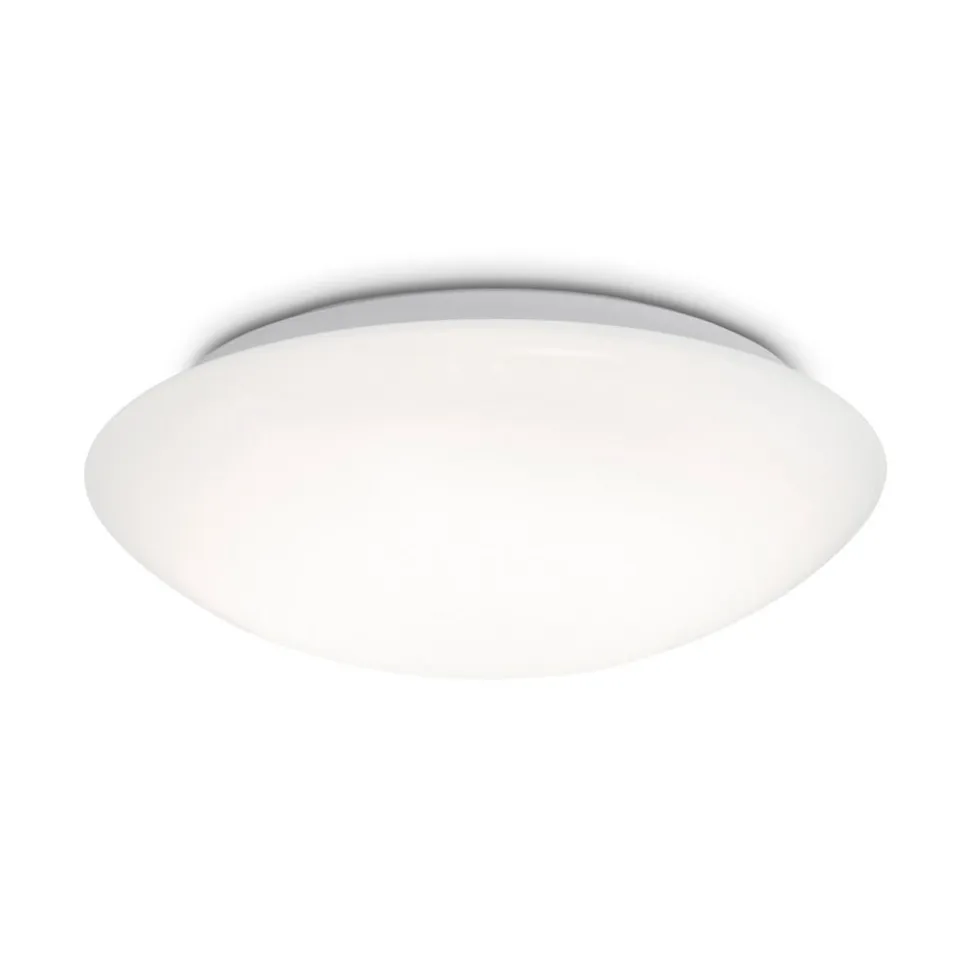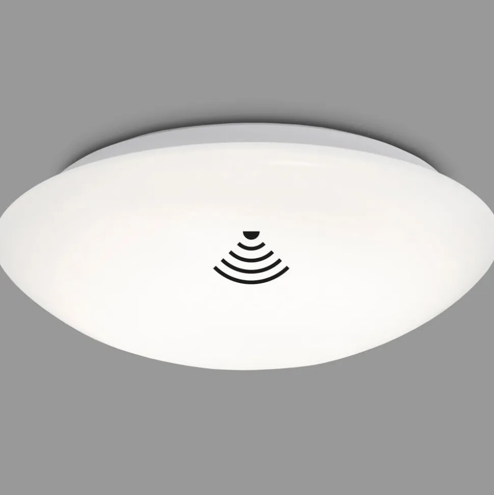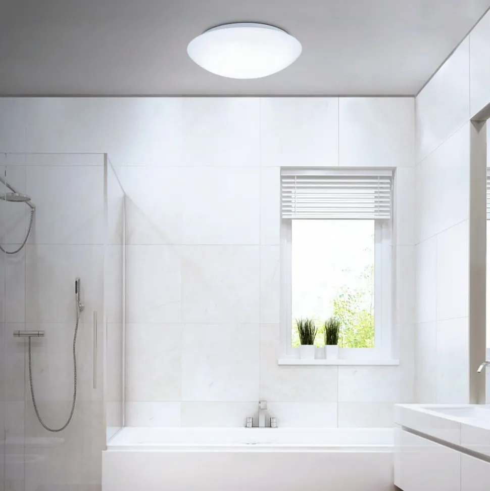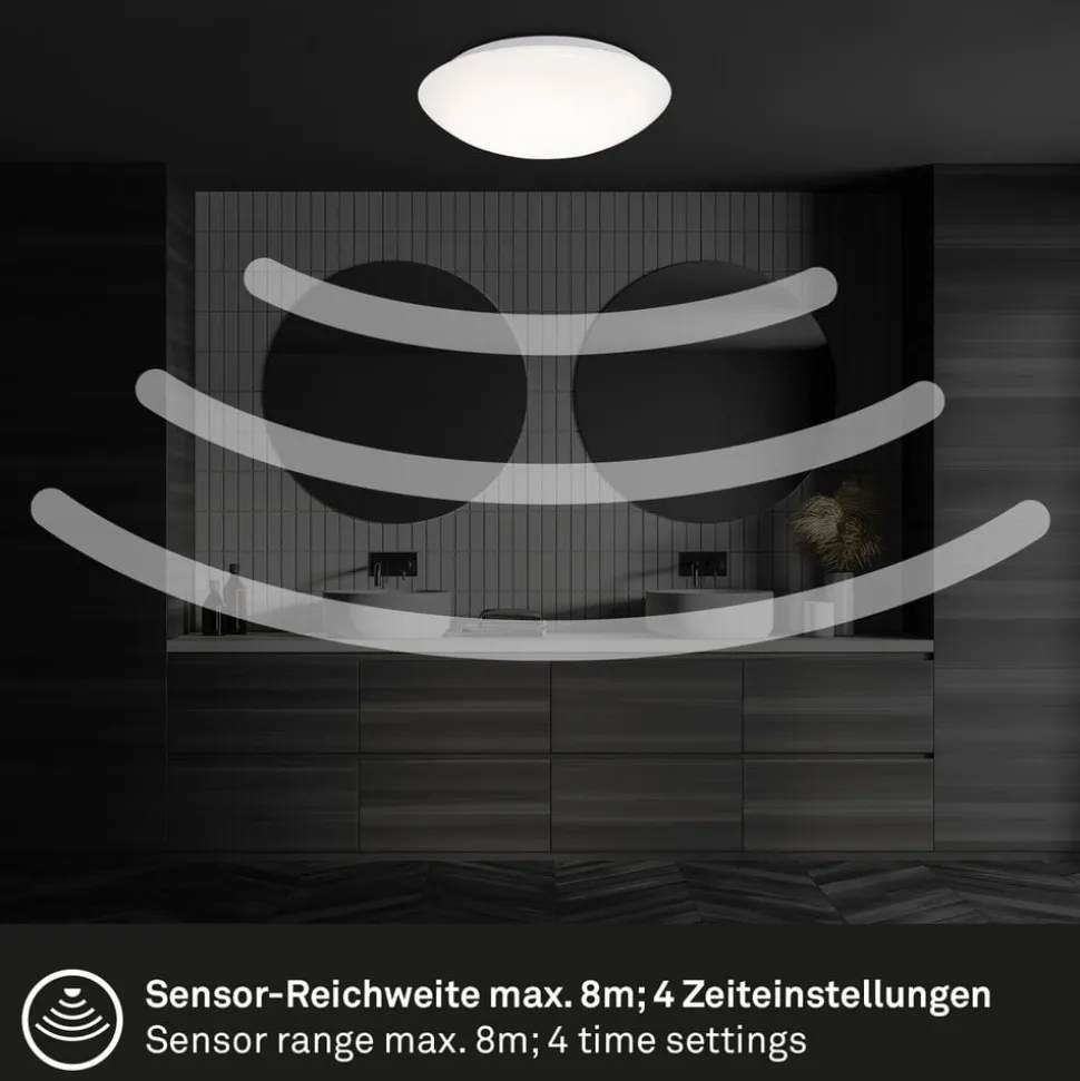 Elipso rund LED-loftslampe, IP44, universal hvid lysfordeling, med sensorstyring Elipso loftslampen er særligt alsidig til universal hvid almenbelysning i store områder – selv på badeværelset takket være stænkbeskyttelsen. Den er udstyret med en rund, konveks afdækning af hvid plast, som spreder lyset fra de integrerede LED’er homogent. Sidstnævnte kan også tændes automatisk takket være den indbyggede dagslys- og bevægelsessensor – Bevægelsessensor kan aktiveres permanent eller kun i mørke – 360° detekteringsvinkel, 8 m rækkevidde – Efterløbstid for bevægelsesdetektering kan indstilles i fire trin fra 5 s til 30 min – Beskyttelsesgrad: IP44