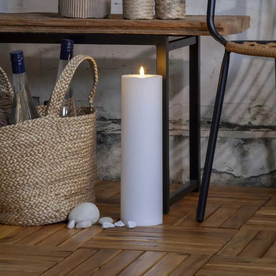 Batteridrevet LED-dekorationslys Flamme Rak til indendørs og udendørs brug – med sensor og timerfunktion Flamme Rak LED-lyset er et praktisk valg til jule- eller festdekorationer i og omkring hjemmet. Dekorationslyset i hvid plast er beskyttet mod vandsprøjt (IP44). Det drives af tre AA-batterier (medfølger ikke) og kan derfor placeres hvor som helst. Det kan tændes automatisk – enten med timer (6 tændt, 18 t slukket) eller skumringssensor.