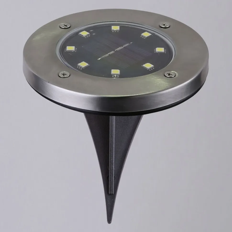 LED-lampen 33414 med solceller og jordspyd i 2-delt sæt er en rund sag, der er ideelt egnet som dekorativ belysning i haven. Under ringen, som er lavet af rustfrit stål, befinder belysningen sig, som består af 8 LED’er, der er arrangeret i en cirkel. De skiller sig frem for alt ud fra det sort plast i tændt tilstand.