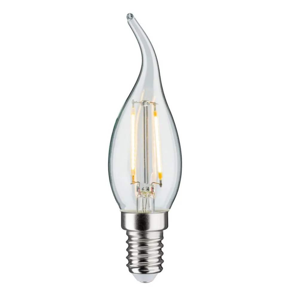 Klar LED stearinlyslampe E14 2,8W glødetråd, pufformet Tekniske specifikationer/egenskaber: – dekorativt look med klart glas i pufform og glødetrådsteknologi – varm lysfarve (2.700 K) – lysudsendelse hele vejen rundt – dæmpbar med mange kommercielt tilgængelige lysdæmpere