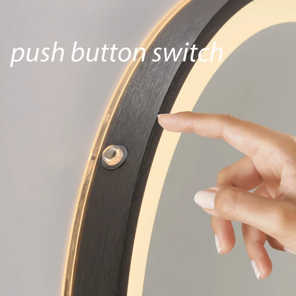 Glasspejlet VIDRO til vægmontering er udstyret med en rund, kontrastfarvet metalramme. Mellem spejlefladen og rammen er der integreret varmhvide LED’er. Lyset fra disse LED’er reflekteres både fremad og bagud mod væggen. Strømforsyningen sker via en medfølgende 5000 mAh powerbank. LED-vægspeglen VIDRO er beregnet til tørre indendørsområder, f.eks. gange, soveværelser og omklædningsrum.