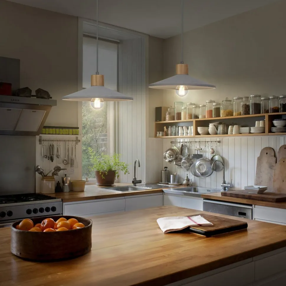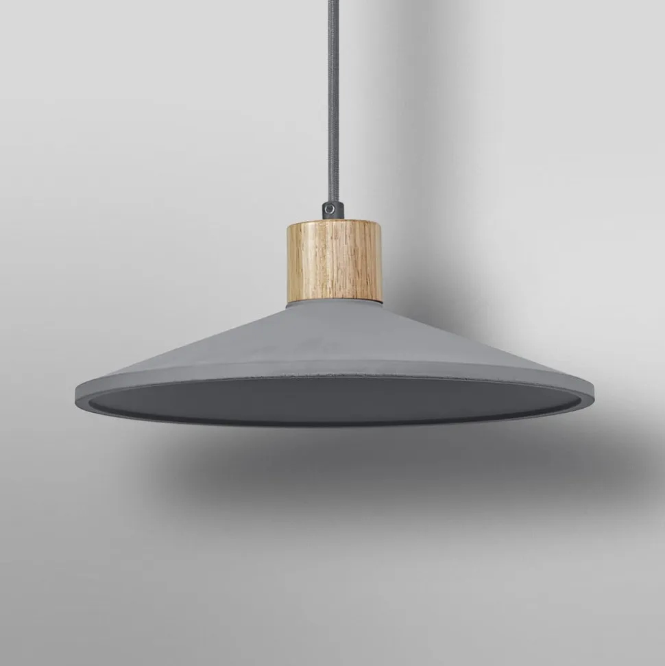 Concrete Wood hængelampe med betonskærm og træelement Concrete Wood hængelampen i betondesign giver en særlig atmosfære til ethvert rum. Den er perfekt til at belyse spiseborde eller køkkenborde. Armaturets brede skærm af beton i høj kvalitet er dekoreret med et træelement ovenover, hvilket giver armaturet en særlig effekt takket være denne kombination af materialer. De klare linjer og det robuste materiale understreger den moderne karakter af young living og skaber en smuk atmosfære. Hængelampen er udstyret med en E27-fatning, så lyskilden kan vælges efter det ønskede lys og udskiftes til enhver tid.