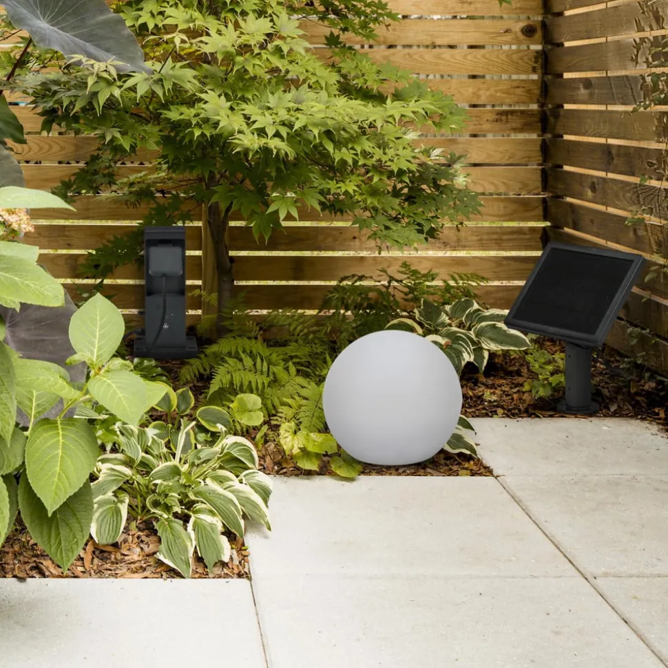 LED jordspyd Endura Hybrid Ball Med det kugleformede LED jordspyd Endura Hybrid Ball kan man skabe dekorative lysaccenter på udendørsarealer. Den hvide kugle skal blot stikkes ned i jorden og lyser med et varmt hvidt lys. Den kan drives på forskellige måder – med solenergi, med energi fra stikkontakten eller en kombination af begge dele for at sikre langvarig belysning. Til drift med energi fra stikkontakten kræves en transformer til tilslutning til lysnettet; til drift med solenergi kræves et solpanel og et tilslutningssæt til tilslutning. Hvis begge driftstilstande kombineres, skifter lampen automatisk til netstrøm, så snart solcellepanelets batteri er tomt. Vigtigt: Solcellepanel, transformer og tilslutningssæt skal bestilles separat som tilbehør – Enkel, værktøjsfri installation uden specialviden takket være stikforbindelser – Maksimal tilsluttet belastning pr. solcellepanel = 24W – Beskyttelsesklasse for stikkene: IP67 – Beskyttelsesklasse for lampen: IP44 – 12 V DC-spænding for maksimal sikkerhed for mennesker og dyr – bæredygtig belysning til udendørsarealer, terrasser, altaner osv.