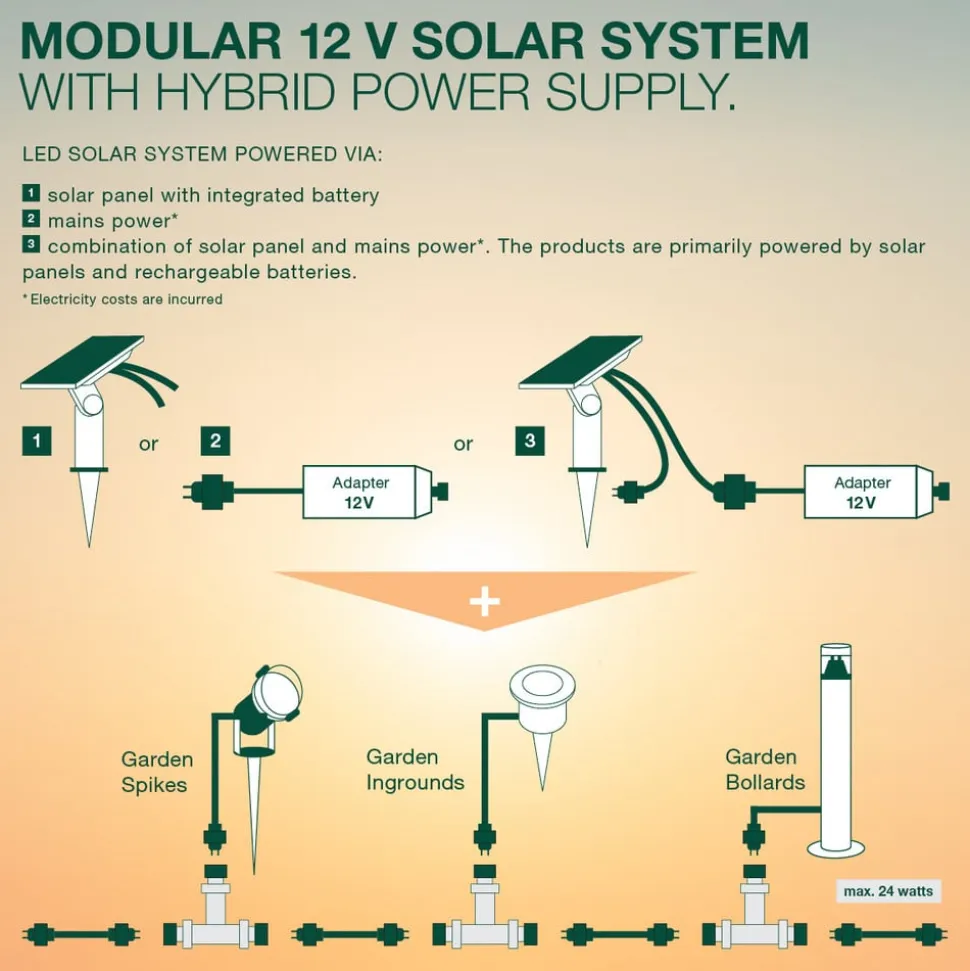 LED-lampen med jordspyd Endura Hybrid Spike har et fladt lampehoved med en stål-afskærmning og rund lysudgang og kan betjenes på forskellige måder. Den sætter varmhvide lysakcenter i haven og stikkes blot ned i jorden ved hjælp af jordspydet. Lampen med jordspyd kan drives med energi fra lysnettet eller selvforsynende med solenergi, og det er også muligt at kombinere de to driftsformer. Til drift med energi fra stikkontakten er der behov for en transformator til tilslutning til lysnettet, til drift med solenergi er der behov for et solcellepanel og et forbindelsessæt. Begge dele kombineret sikrer permanent belysning, da lampen i dette tilfælde automatisk skifter til netstrøm, så snart solcellepanelets batteri er tomt.