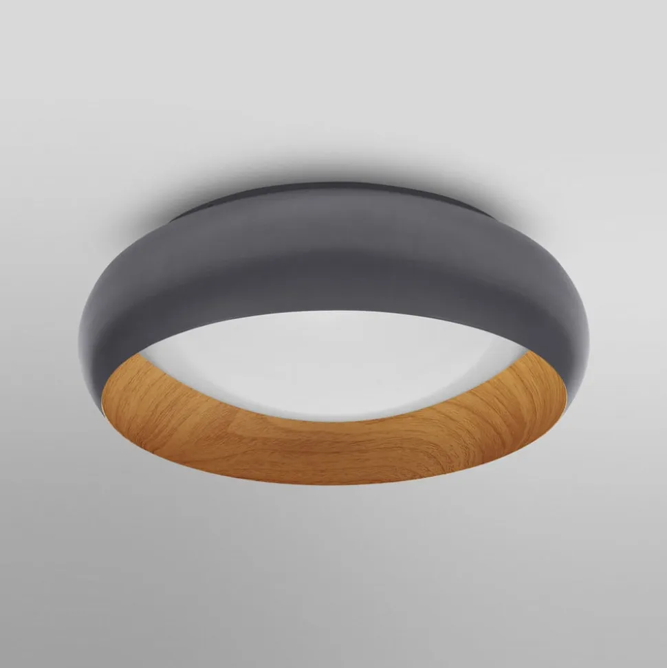 Orbis Livia LED-loftlampe i grå med trædekor indvendigt Alsidig, energieffektiv, dekorativ og attraktiv – det er alle egenskaber ved Orbis Livia LED-loftlampe fra LEDVANCE. Armaturet består af en metalring med en mørkegrå finish på ydersiden og en smuk trædekor på indersiden samt en diffusor af PMMA, hvorigennem lyset fra de indbyggede LED’er sendes jævnt ud. Armaturet kan dæmpes via lyskontakten uden at installere en lysdæmper. Gentagne skift gør det muligt at justere lysstyrken i tre trin (100 %, 50 %, 15 %). Obis Livia loftlampe passer ind i mange indretningsstile og leveres med monteringsmateriale.