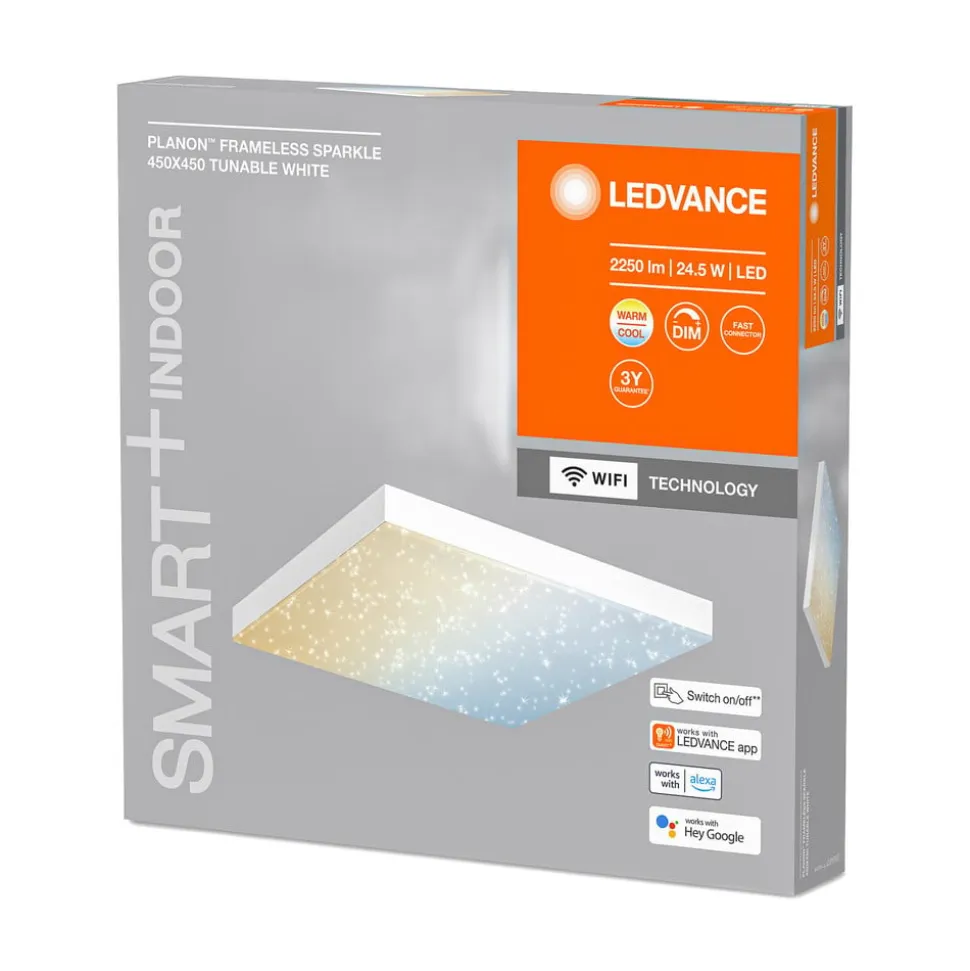 Planon FL Sparkle LED-panel med CCT-funktion og SMART WiFi-teknologiDet flade, kantede Planon FL Sparkle LED-loftarmatur kan styres smart takket være WiFi-teknologi, nemlig efter WLAN-forbindelse via tablet eller smartphone med LEDVANCE SMART WiFi-appen, der er gratis tilgængelig til Android- og iOS-enheder. Stemmestyring med Google Assistant eller Amazon Alexa er også mulig. Panelet har et rammeløst design og et plastikdæksel, der skaber en funklende stjernehimmel i rummet takket være glitrende effekt. Lysstyrken og farvetemperaturen kan justeres, så den passer til situationen. LED-panelet er hurtigt og nemt at installere, det komplette installationsmateriale medfølger.- Dæmpbar- Lysfarve justerbar: varm hvid (3.000 K) til dagslys (6.500 K)- Smart integration via WLAN- Styrbar via LEDVANCE SMART WiFi app- Stemmestyring via Google Assistant eller Amazon Alexa mulig