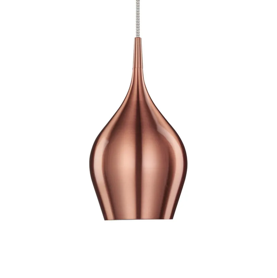 Vibrant pendel i klokkeform Den lille Vibrant pendel imponerer med sin klokke- eller dråbeformede form og skinnende farve. Lampeskærmen i aluminium er farvet på ydersiden og har en smuk glans. Indersiden er hvidmalet, så lyset fra E14-pæren reflekteres fremragende og derved intensiverer lyset. Som et lille pendelarmatur er Vibrant ideel til målrettet belysning af borde eller diske. Den stilfulde pendel skaber også en behagelig atmosfære som ekstra lys, for eksempel over en kommode eller et lille sidebord.