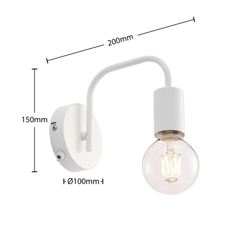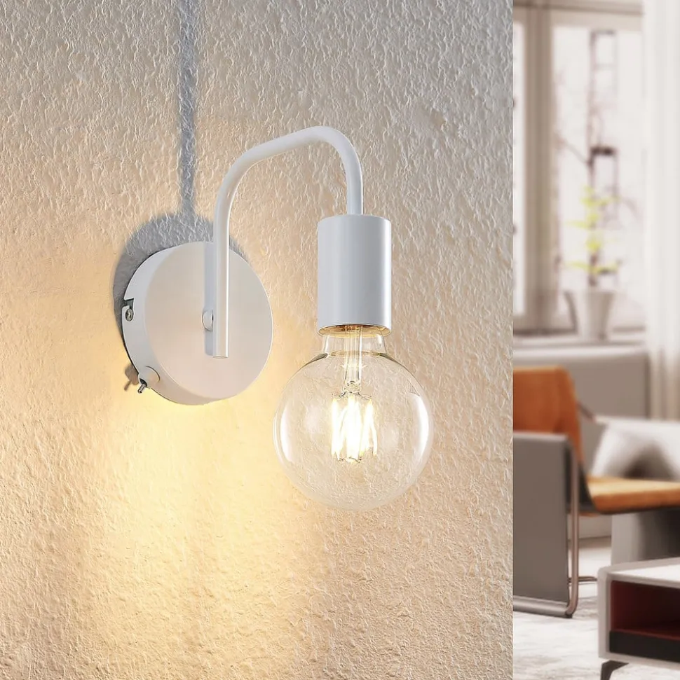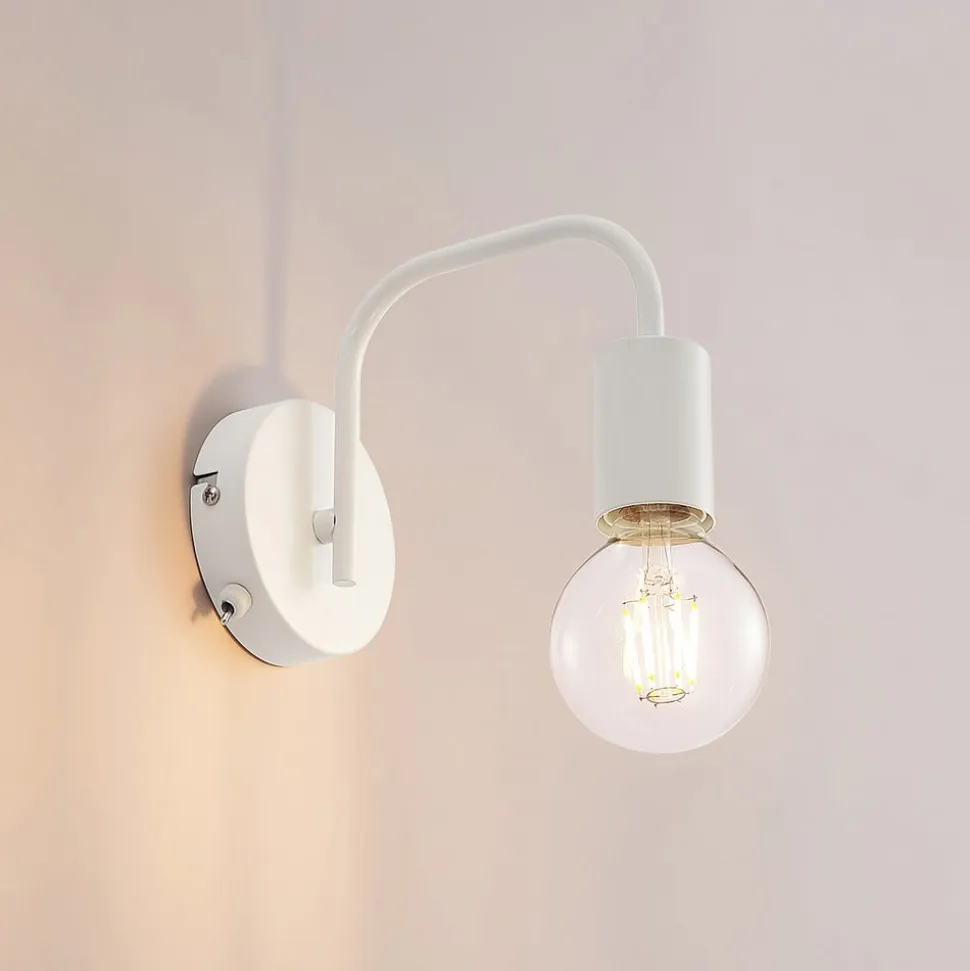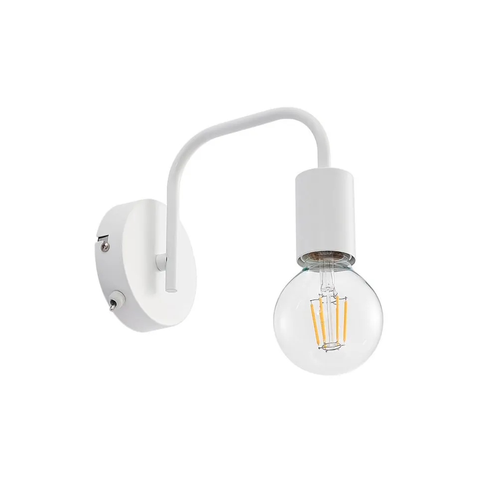 Hvid væglampe Erivana, skærmfri i et enkelt look Erivana kommer i et diskret design og imponerer med sit hvide udseende. Stellet er helt i jern og har ingen lampeskærm, hvilket efterlader lyspunktet uhindret. Den anvendte pære bør derfor have en dekorativ karakter og understrege armaturets udseende. Pærer er særligt velegnede her, da de som regel findes i en LED-udgave og er kendetegnet ved deres økonomiske strømforbrug. Erivana kan integreres i en lang række moderne interiører. Den kan betjenes hurtigt og bekvemt takket være den integrerede kontakt.