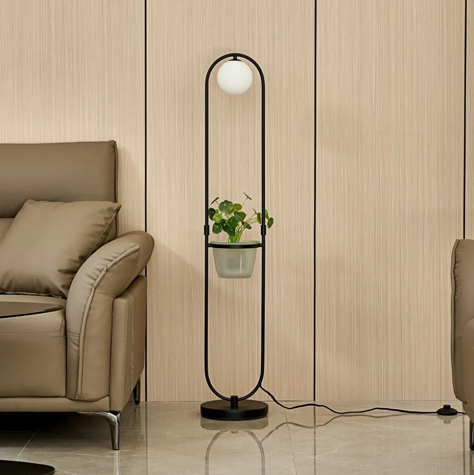 Attraktiv gulvlampe Orna med integreret urtepotteDenne gulvlampe fuldender din indretning på en stilfuld måde. Du kan nemt tænde eller slukke gulvlampen ved hjælp af en lyskontakt. Lampen er udstyret med en G9-fatning. Denne gulvlampe kombinerer alle de kvaliteter og særlige egenskaber, der kendetegner Lindby-mærket. Gulvlampen er i farverne sort og opal. Med denne gulvlampe vil dine fire vægge blive endnu hyggeligere. Den blomsterkrukke, der er integreret i dens krop, kan plantes efter behov og bringer et lille stykke naturlighed til dit interiør.